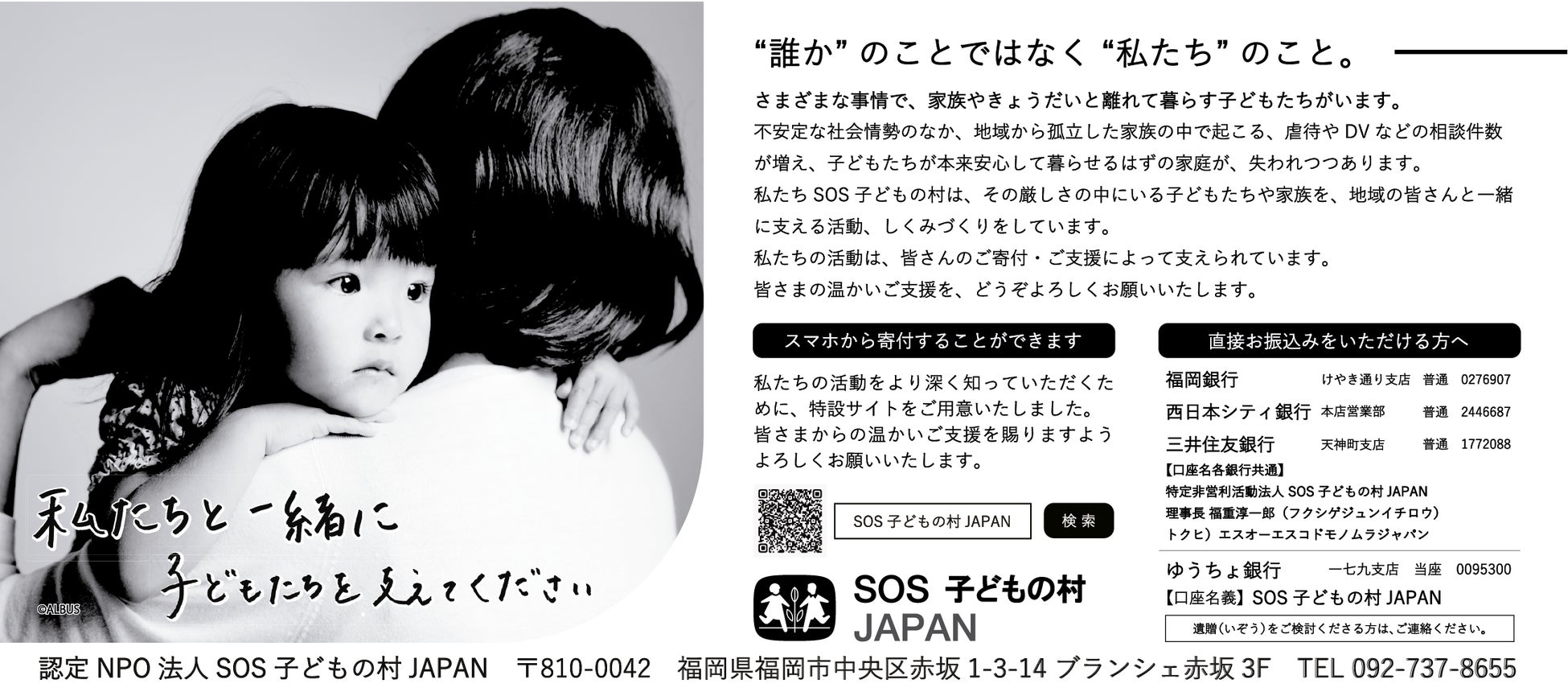 認定NPO法人「SOS子どもの村JAPAN」(https://www.sosjapan.org/)は、オーストリアに本部を置き130以上の国と地域で活動する国際NGO「SOS Children’s Villages International」の日本法人です。世界共通のスローガン「すべての子どもに愛ある家庭を」のもと、福岡を中心に子どもと家族が地域社会から孤立しない地域づくりに取り組んでいます。私たちの活動を知っていただくために、新聞広告を出稿いたしました。