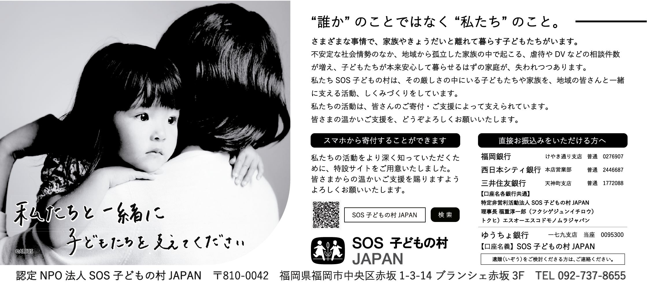 私たちだけでは、子どもと家族に関わる社会問題に取り組むこと、向き合うことはできません。地域社会で生活をしている皆さんの支えと助けが必要不可欠です。