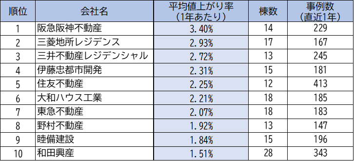 2位の三菱地所レジデンスは、「ザ・パークハウス」シリーズをはじめとする高額物件から昨今値上がり率が大きいDINKS向けやファミリー向けなど幅広い世帯のニーズに沿った高品質な物件を供給する大手デベロッパーで、本年関東でも3位、関西の値上がり率で今年は2位となりました。