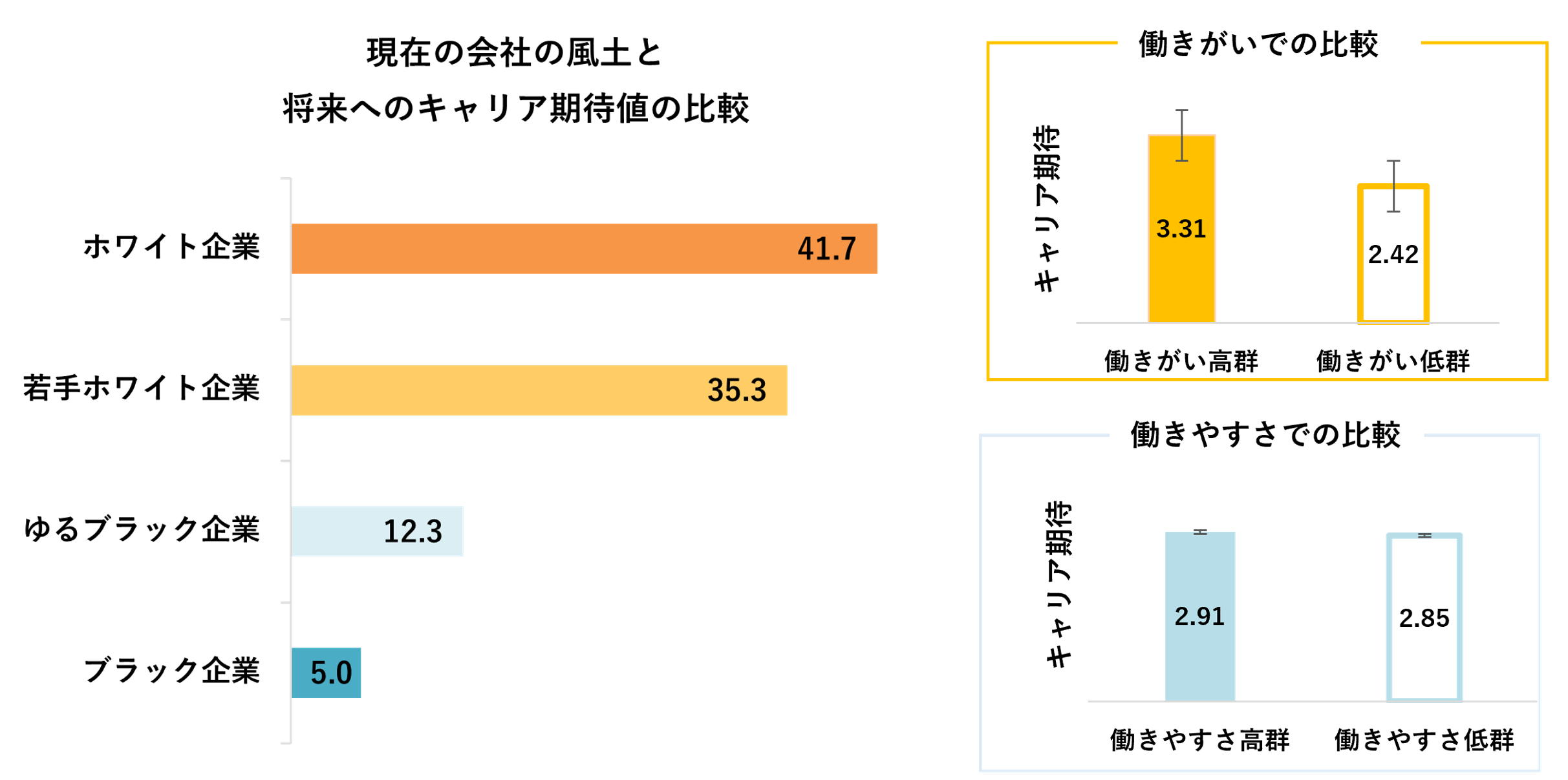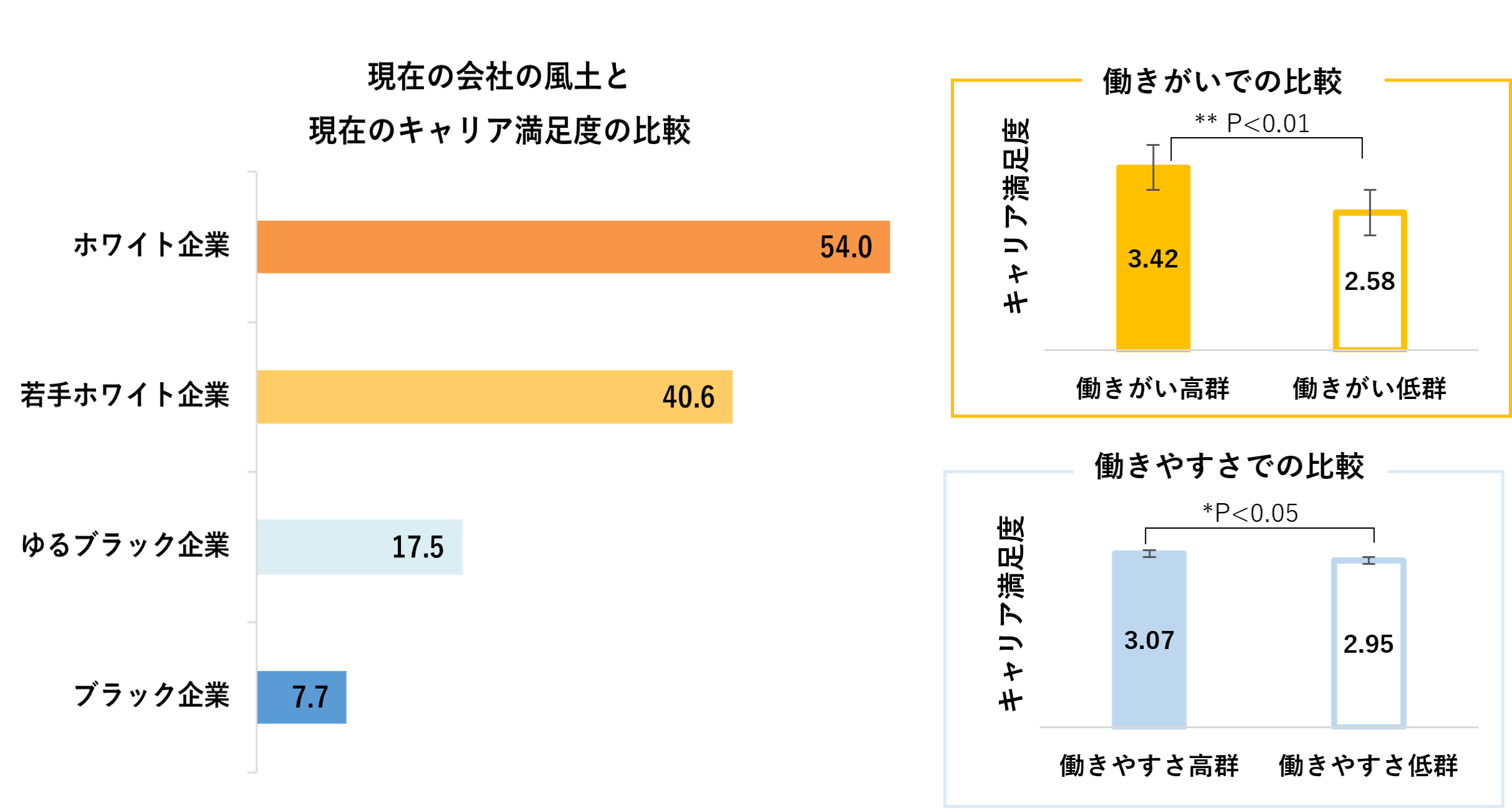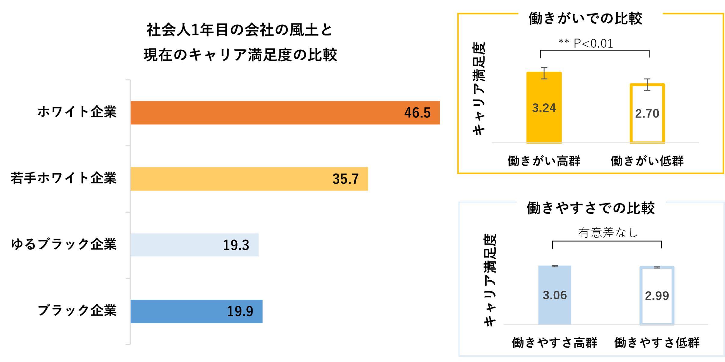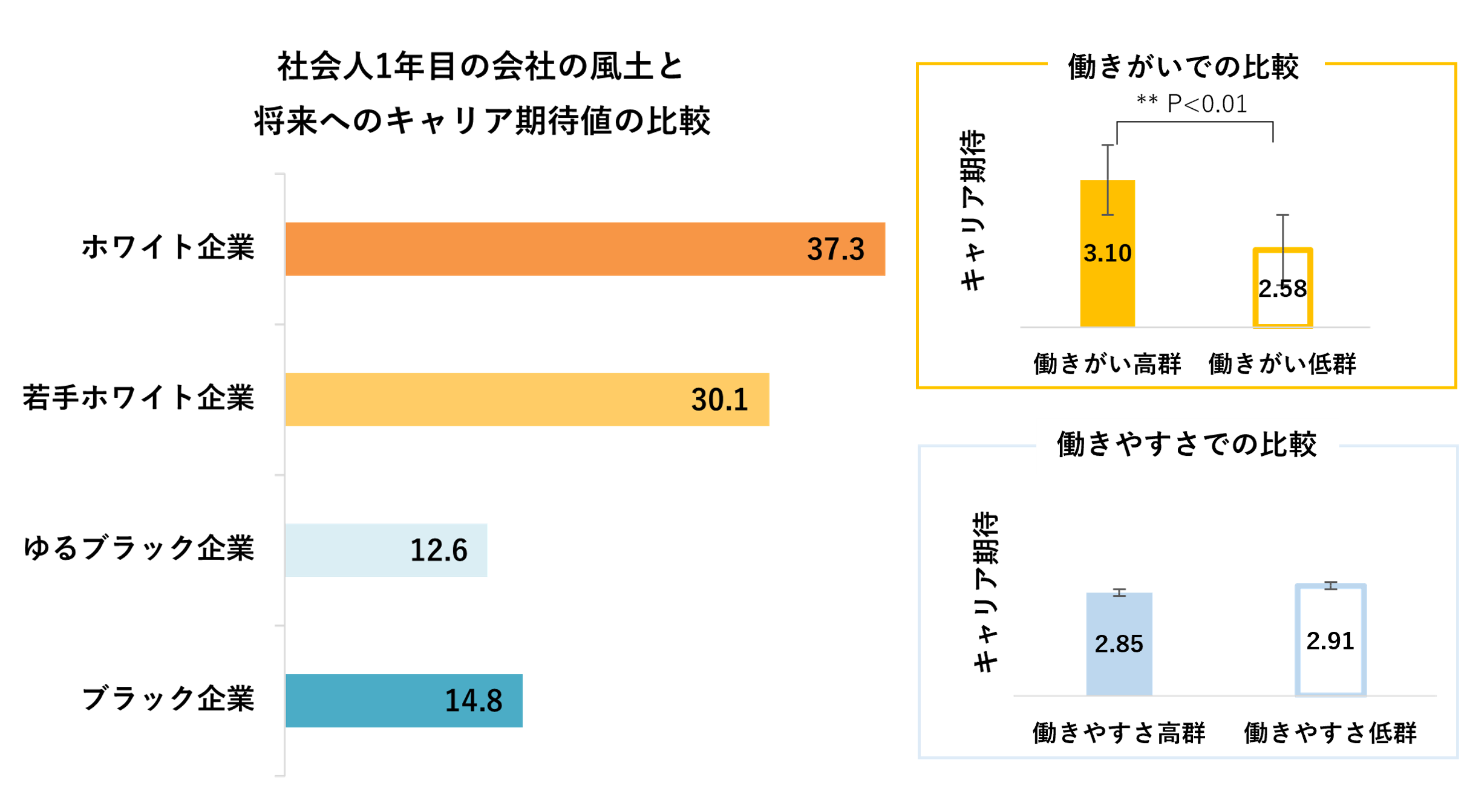 社会人1年目の会社の風土は、将来のキャリアへの期待値に関係することが明らかになりました。キャリアへの期待が最も低かったのは、社会人1年目の会社が、働きやすいが働きがいがない「ゆるブラック企業」の風土の12.6%で、社会人1年目の会社が「ブラック企業」の風土の14.8%よりも、低い結果となりました。社会人1年目の風土の働きがいと働きやすさの観点から将来へのキャリア期待値の差をそれぞれ比較したところ、社会人1年目の会社の風土の働きがい高群(若手ホワイト企業、ホワイト企業)は、働きがい低群(ゆるブラック企業、ブラック企業)に比べて優位に期待感が高いことがわかりました。一方、社会人1年目の会社の働きやすさでの比較では、キャリア期待値に有意差はありませんでした。