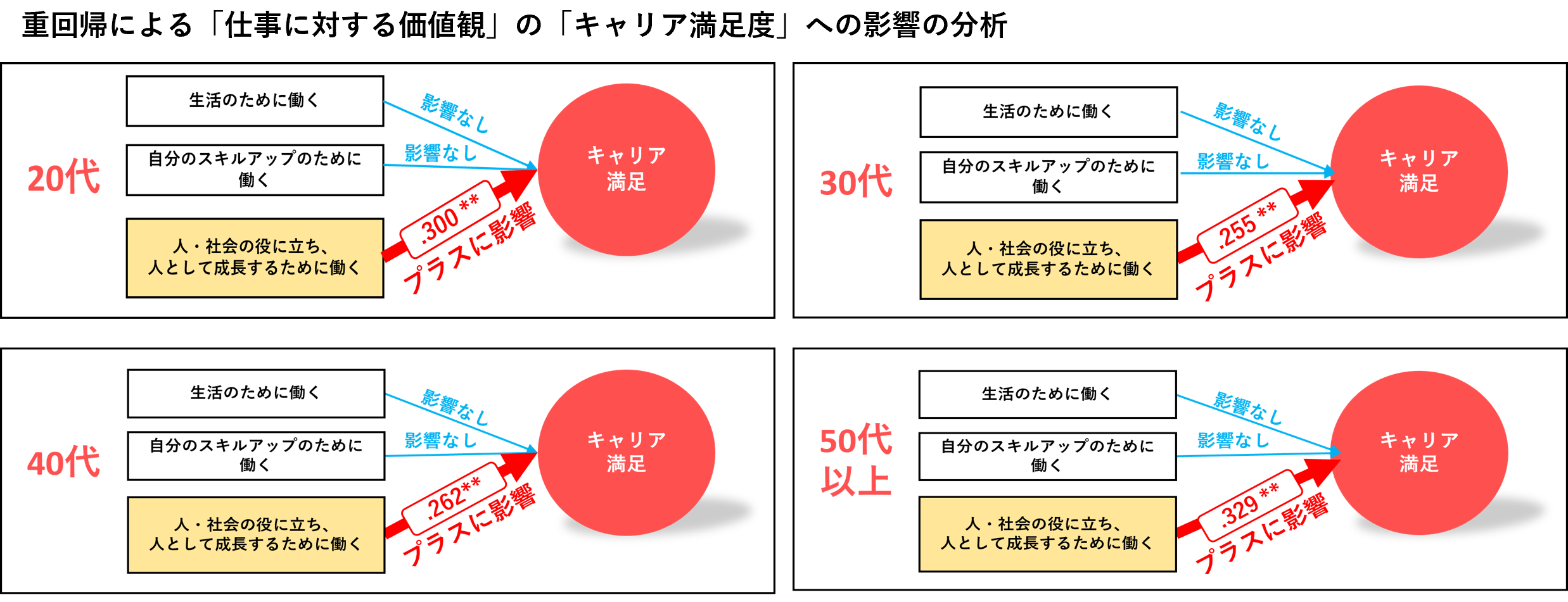 仕事に対する価値観として、「生活のために働く」「自分のスキルアップのために働く」「人・社会の役に立ち、人として成長するために働く」の3つの価値観を定義し、キャリア満足度に影響しているかを各年代ごとに調べました。その結果、今回の調査ではすべての年代において「人・社会の役に立ち、人として成長するために働く」という価値観がキャリア満足度にプラスに影響していることがわかりました。