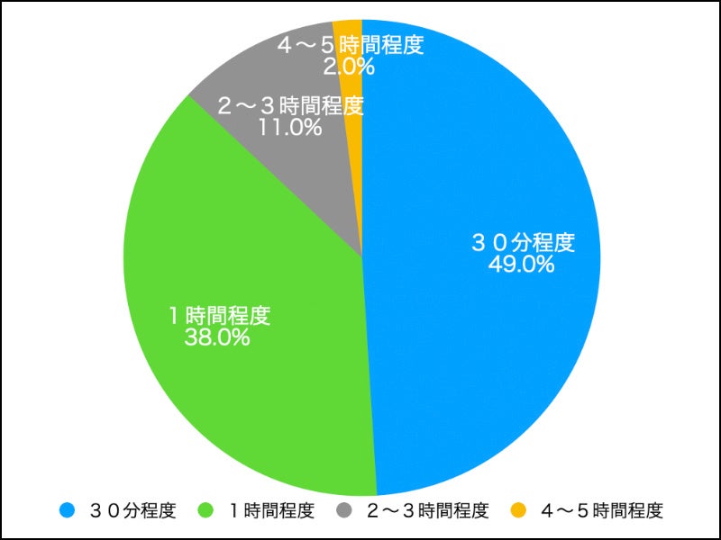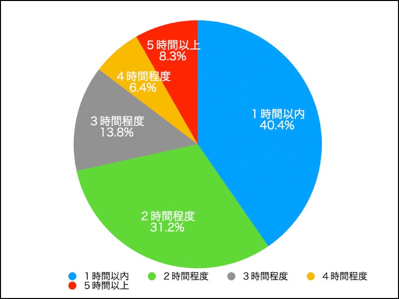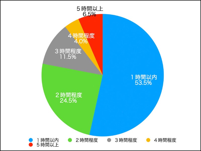 回答者全員のグラフと比べると、1時間以内が53%→40%に減っていて、2時間程度〜5時間以上の割合が少しずつ増えていることがわかります。