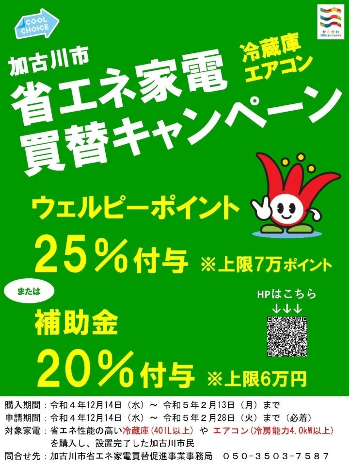 省エネ家電への買替対象期間中に、市内の家電販売店等において対象家電を購入設置した市民に対し、かこがわウェルピーポイント、もしくは現金での助成が行われます。