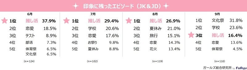 - 「印象に残ったエピソード」として「学生イベント」を抜いて3ヶ月にわたり「推し活」が1位にランクイン。