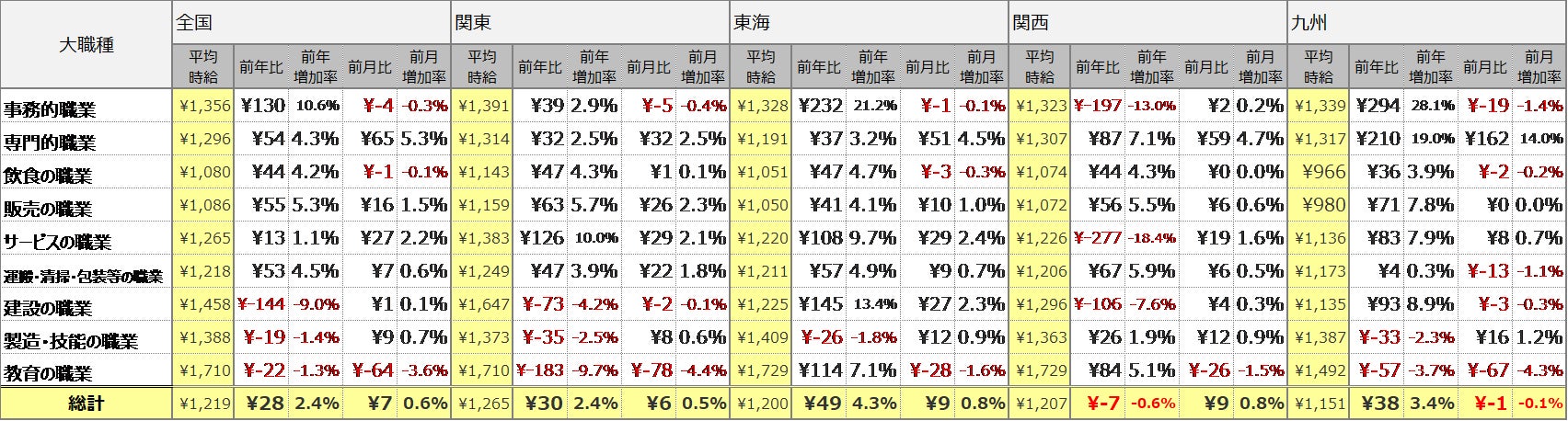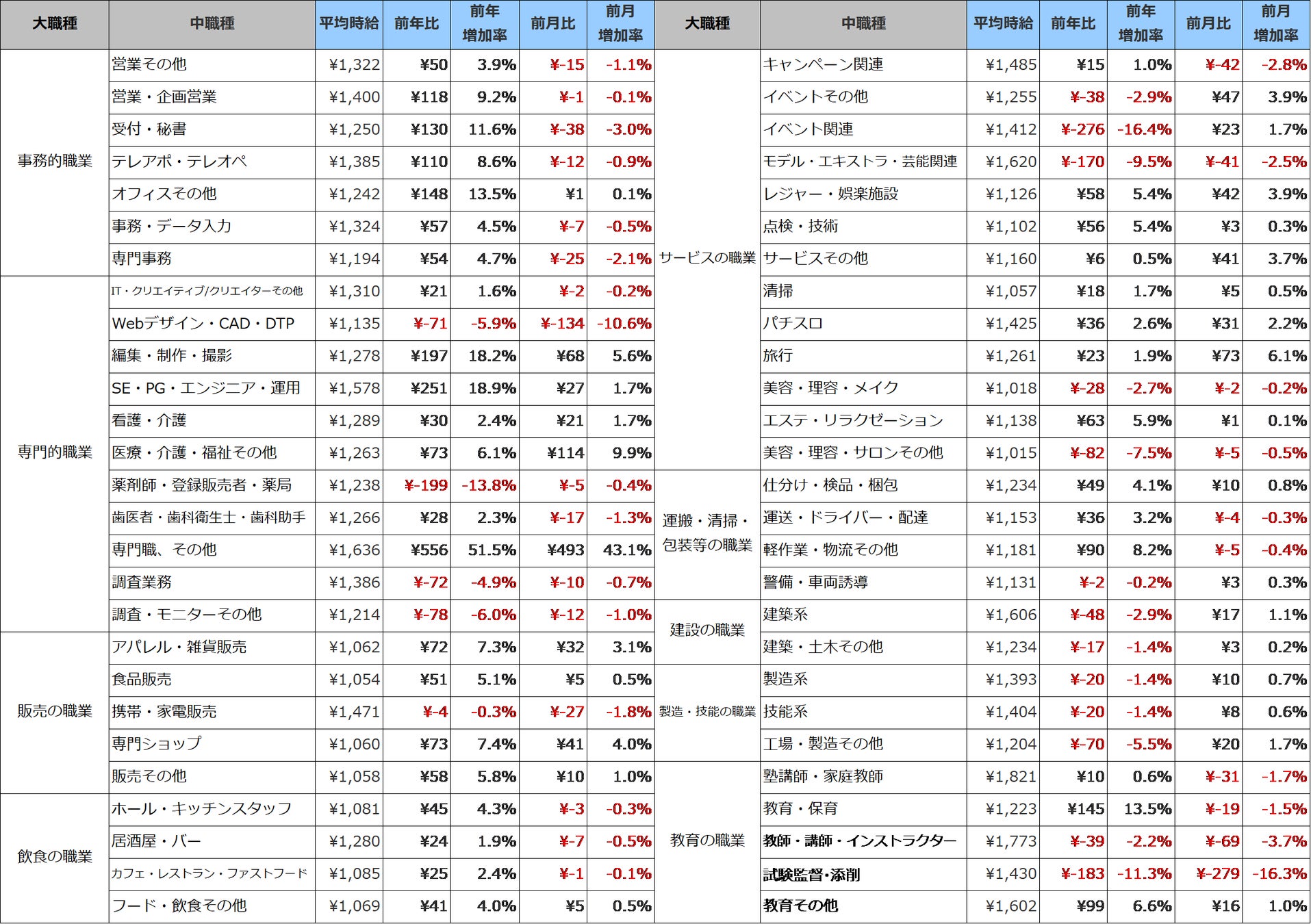 職種別の平均時給は、9職種中6職種の大カテゴリが前年を上回りました。事務的職業は1,356円(前年比130円増、前月比4円減)、専門的職業は1,296円(前年比54円増、前月比65円増)、飲食の職業は1,080円(前年比44円増、前月比1円減)、販売の職業は1,086円(前年比55円増、前月比16円増)、サービスの職業は1,265円(前年比13円増、前月比27円増)、運搬・清掃・包装等の職業は1,218円(前年比53円増、前月比7円増)、建設の職業は1,458円(前年比144円減、前月比1円増)、製造・技能の職業は1,388円(前年比19円減、前月比9円増)、教育の職業は1,710円(前年比22円減、前月比64円減)となりました。