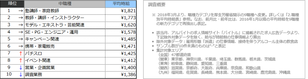 関東エリアの平均時給は1,265円(前年比30円増、前月比6円増)、東海エリアの平均時給は1,200円(前年比49円増、前月比9円増)、関西エリアの平均時給は1,207円(前年比7円減、前月比9円増)、九州エリアの平均時給は1,151円(前年比38円増、前月比1円減)となりました。