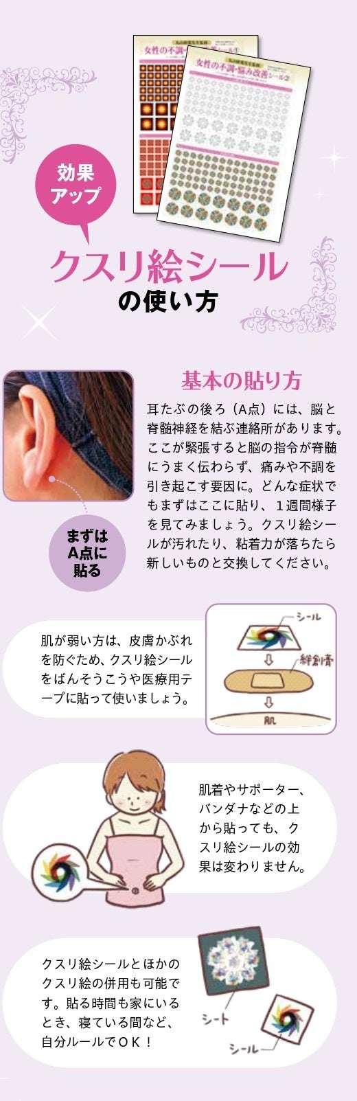 本書では更年期以降の女性の悩みに焦点を当て、痛みや不調に効くクスリ絵を厳選しました。付録のクスリ絵シールは、痛みや不調を取り去るパワーが強い図柄を選出、体に直接または肌着の上から貼って使えるようにしたものです。