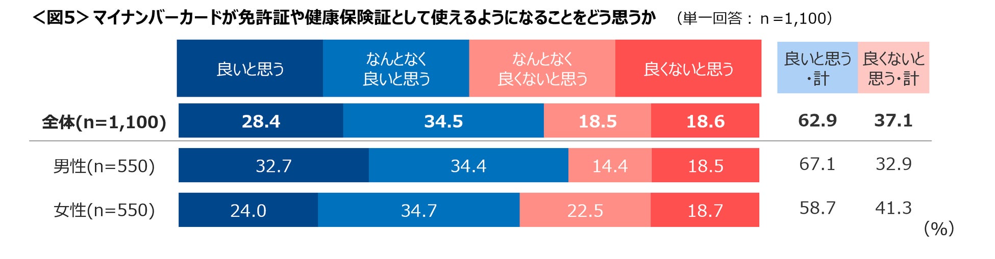 マイナンバーカードが免許証や健康保険証として使えるようになることについては、62.9%が「良いと思う」「なんとなく良いと思う」と回答。一方、「なんとなく良くないと思う」「良くないと思う」が37.1%と、肯定的意見が否定的意見を上回っている。<図5>