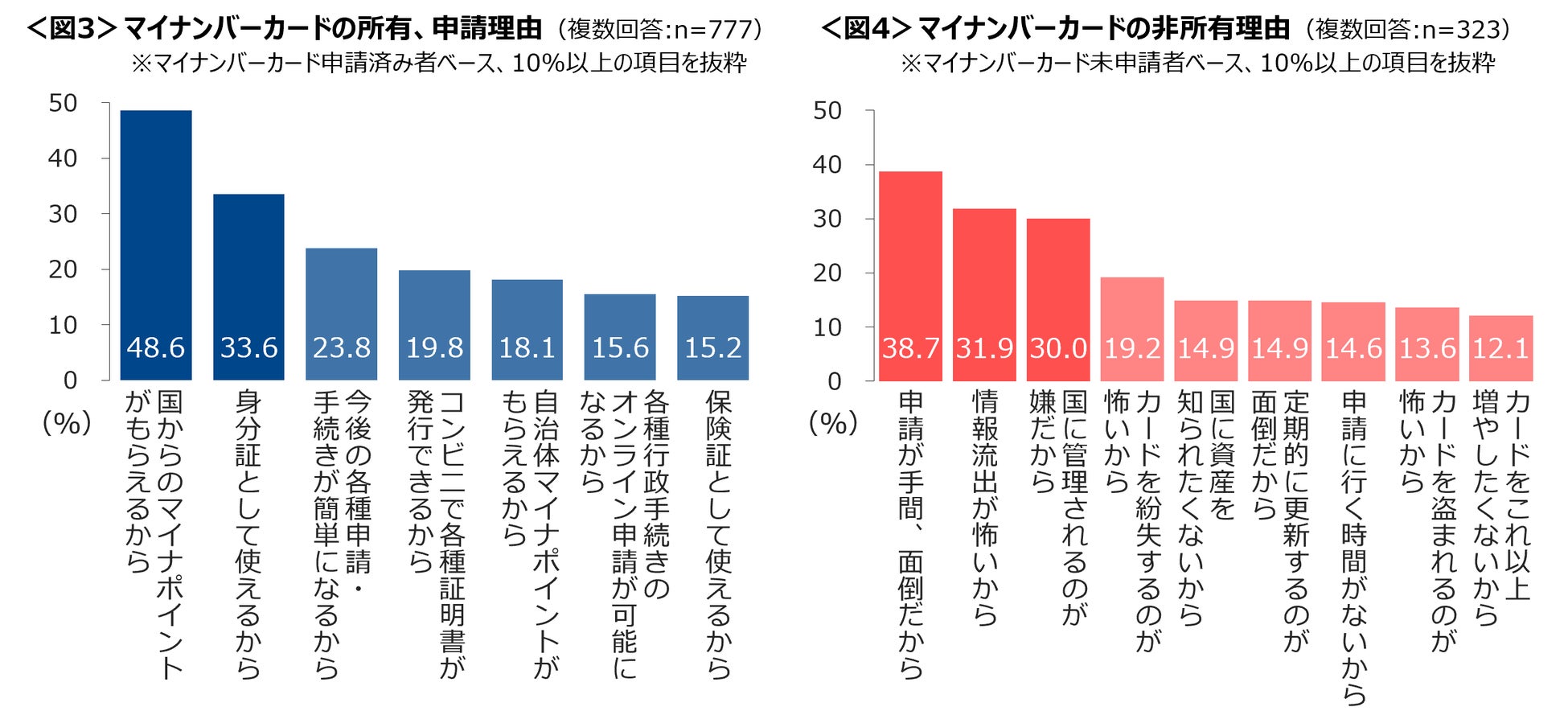 非所有の理由は、「申請が手間、面倒」という声が最も多く、次いで「情報流出が怖い」と「国に管理されるのが嫌」であり、いずれも3割を超える。<図4>