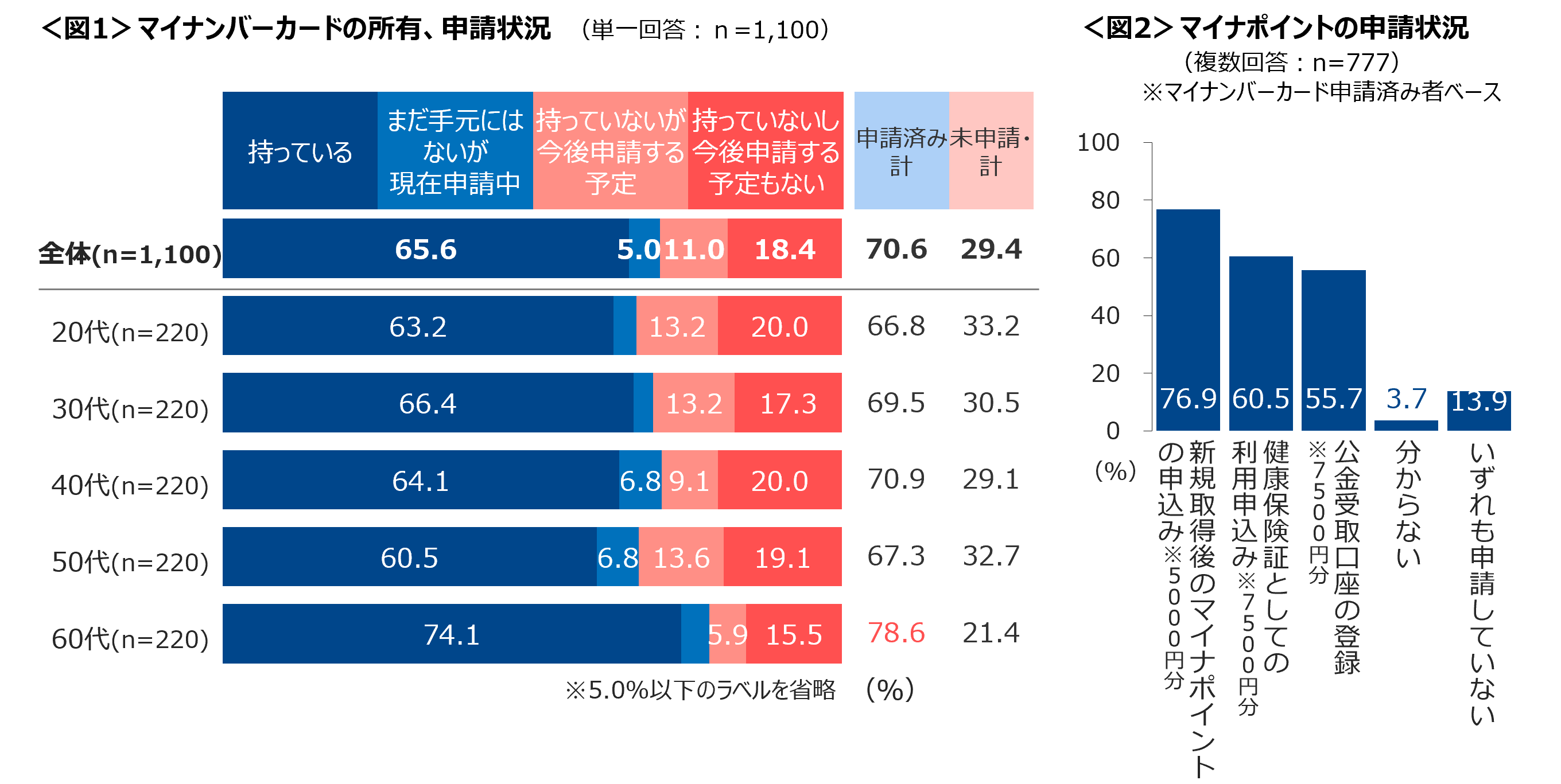 マイナンバーカード所有・申請中の人のうち、マイナポイント申請は、「新規取得後」が76.9%、「健康保険証」が60.5%、「公金受取口座の登録」は55.7%と各ポイントとも半数以上が申請している。<図2>