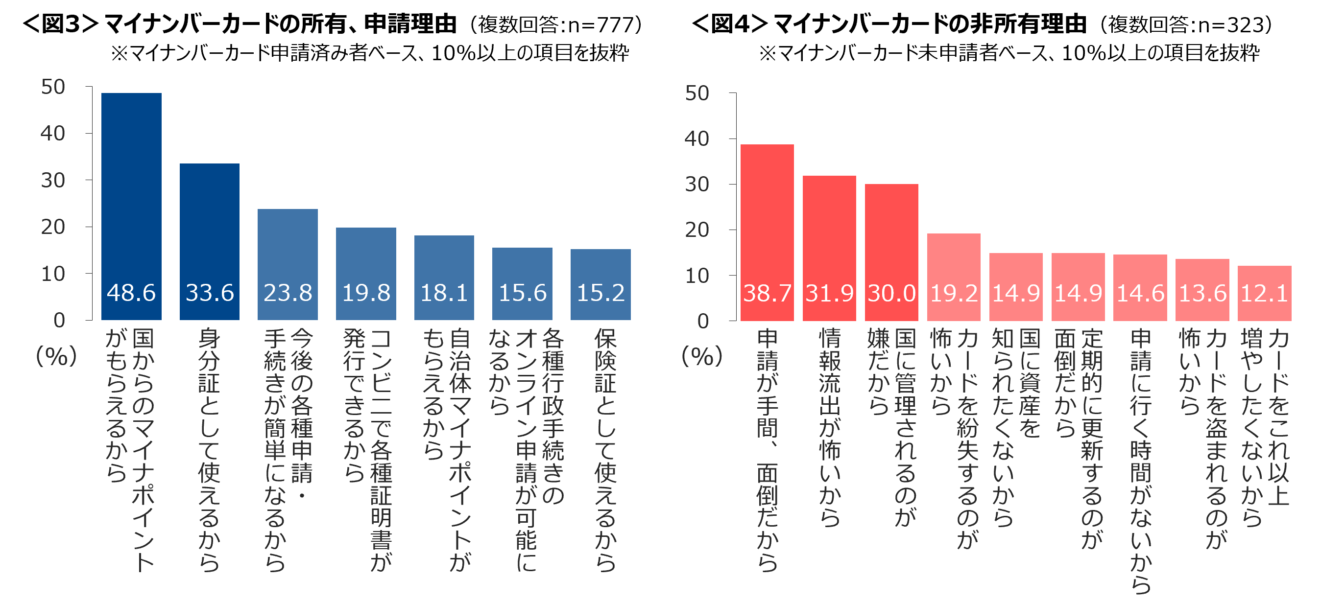 非所有の理由は、「申請が手間、面倒」という声が最も多く、次いで「情報流出が怖い」と「国に管理されるのが嫌」であり、いずれも3割を超える。<図4>