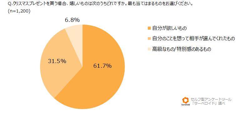 「クリスマスプレゼントを貰う場合、嬉しいものは次のうちどれですか。」という質問に対して6割が「自分が欲しいもの」と回答しました。クリスマスプレゼントをあげる予定のある方は事前にどんなものが欲しいか聞いておくと良いでしょう。