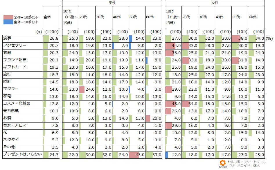 性別で比較すると男性の方が「プレゼントはいらない」と思っている割合が多い傾向にあります。また、女性の若年層では「アクセサリー」や「衣服」「マフラー」など身に着けるアイテムが他年代と比べて高い傾向が見られました。