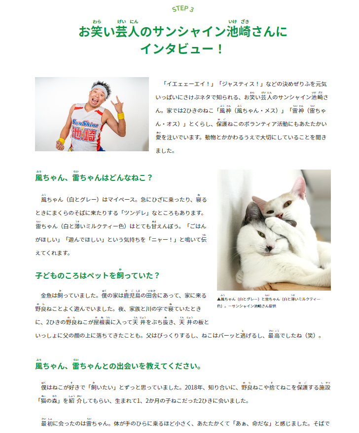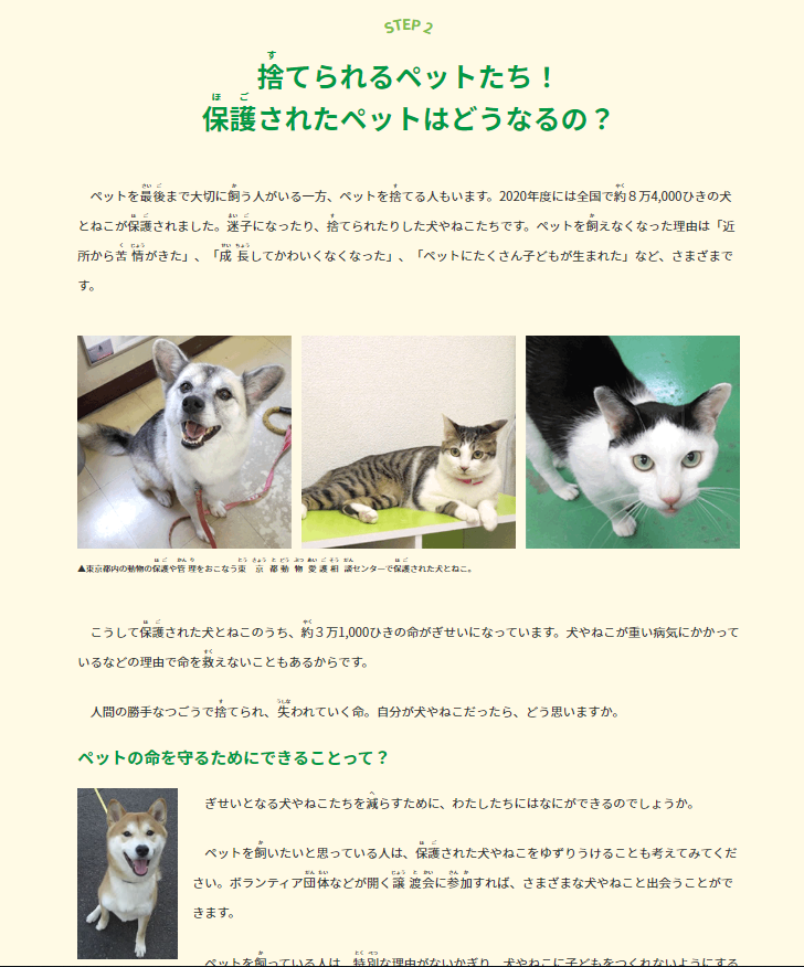 人とペット、双方の幸せに必要なことは何でしょうか。飼い主を失い保護される犬猫の事例も紹介し、命の大切さや命を預かる責任について、子供達に考えてもらおうという企画です。今月号はWEB版に加え、都内の小学校、児童館に配布する「壁新聞(印刷版)」も発行しました。ぜひご注目ください。