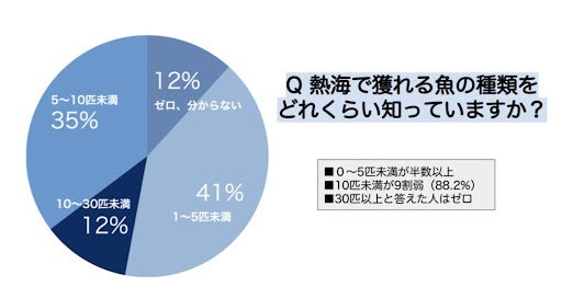 熱海に住む・暮らす方々を対象に約50名にアンケートを実施したところ「熱海で獲れる魚の種類をどれくらい知っていますか?」という質問に対して、「0〜5種類未満」と答えた方が半数以上、「10種類未満」が約90%という結果になりました(熱海千魚ベースプロジェクト調べ/熱海市で暮らす・働く方々約50名へアンケートを実施)。