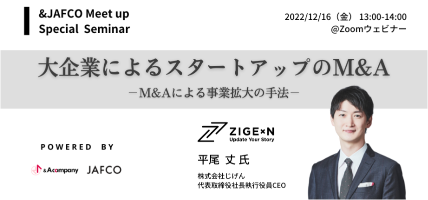 このような背景から、M&Aを検討している企業のM&A実行における課題を解決し、スタートアップのエグジットの選択肢を広げ、国内マーケットの発展に貢献するためじげんが立ち上げた新会社「and A company」と、1973年の創業以来、ベンチャーキャピタルとして4,000社以上の企業への投資を行ってきた「ジャフコ」は、「大企業によるスタートアップのM&A~M&Aによる事業拡大の手法」をテーマにウェビナーを共催いたします。