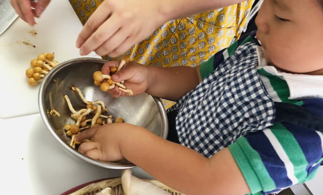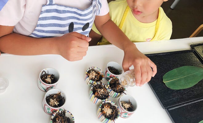 人にそなわった五感は、生きる喜びの土台となるものです。メニューづくりから旬の食材選び、本物の道具を使ったお料理、きちんとした食器でいただいてお片付け。和のサペレ時間、子どもたちはいろんなところで五感を働かせています。