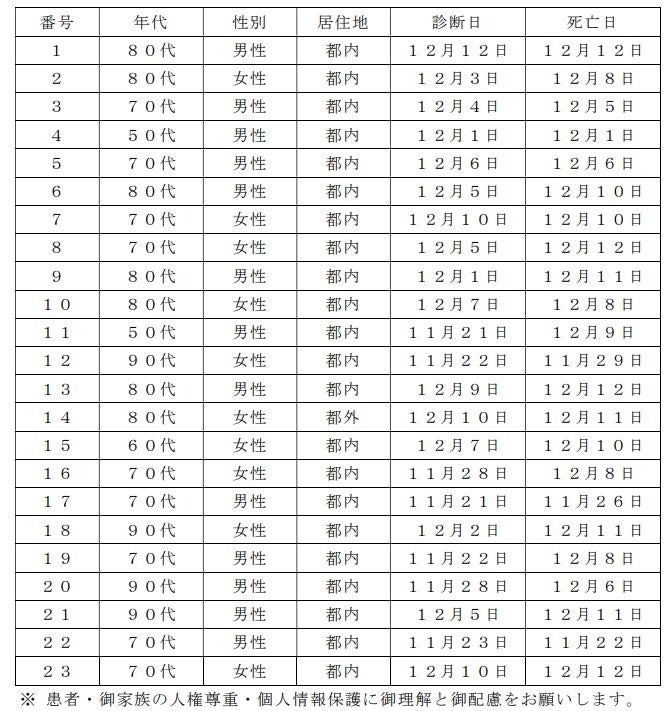 新型コロナウイルスに関連した患者の死亡について business Twitter Facebook はてブ Pocket LINE コピー 2022.12.14 この記事は約1分で読めます。 都内で新型コロナウイルスに感染した方が死亡されましたのでお知らせします。 お亡くなりになった方のご冥福をお祈り申し上げます。 1 新型コロナウイルスに関連した死亡者(本日公表分) 2 新型コロナウイルスに関連した死亡者の累計 6,437人