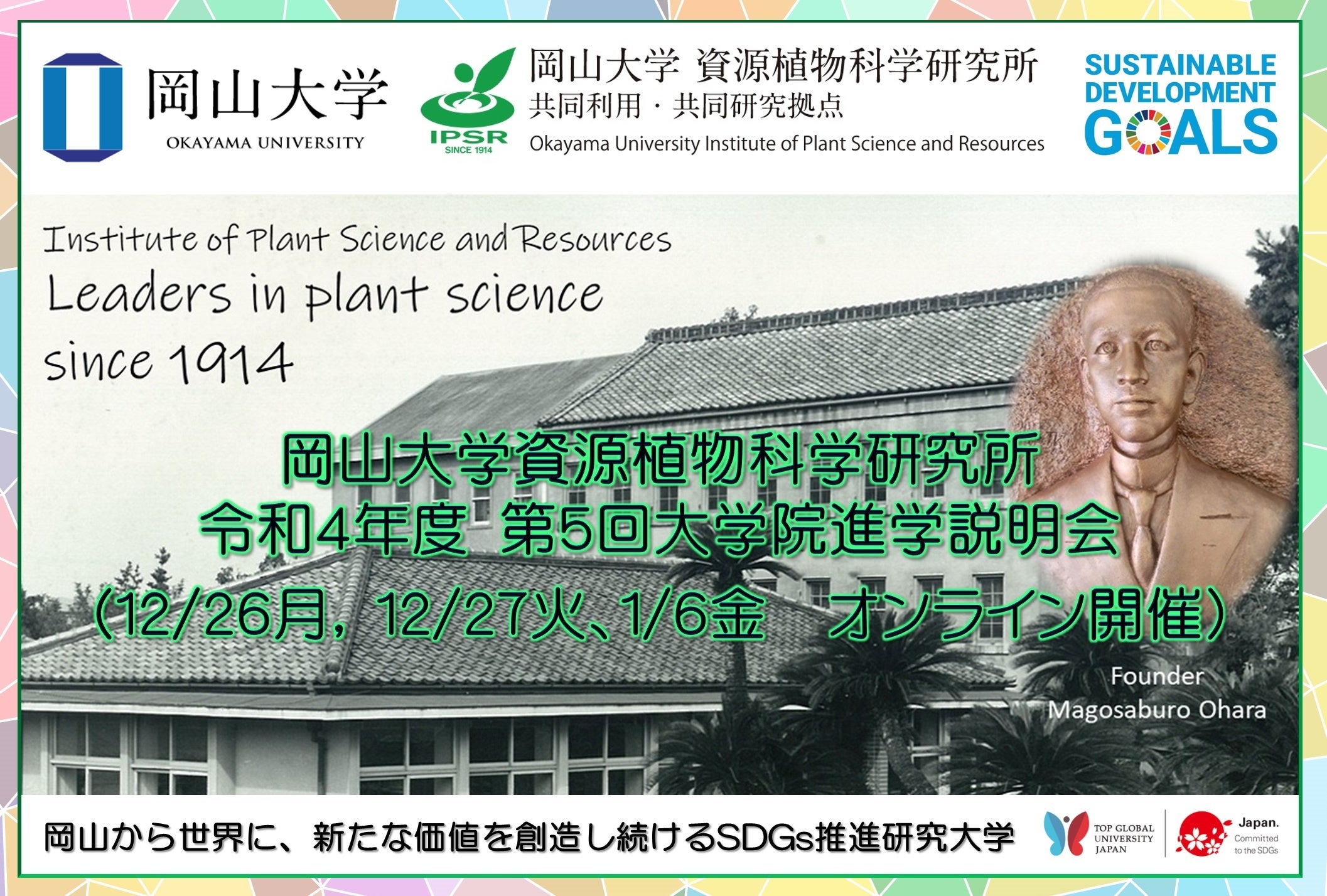 国立大学法人岡山大学(本部:岡山市北区、学長:槇野博史)の資源植物科学研究所(倉敷市)では、大学院進学を検討されている皆様を対象に、本年度第5回となる「大学院進学説明会」をオンラインで開催します。