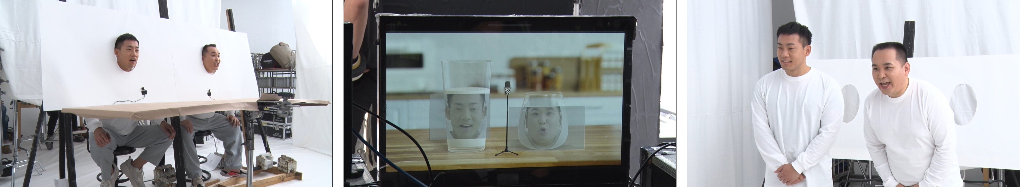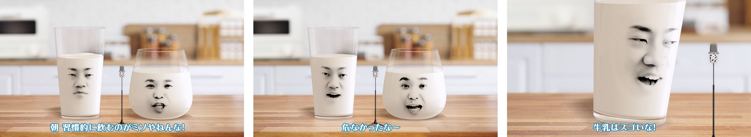 今回は顔出しパネルを使った表情のみでの撮影ということで、普段の漫才とは違った撮影にやや緊張気味のミルクボーイのお二人。言葉数の多いセリフに苦戦しながらも、言い方や細かい表情、顔の角度など細部まで調整して撮影に臨んでいました。ついに3作目にして牛乳になりきったミルクボーイさんの、少し不思議なWEB動画の舞台裏を見ることができる注目のメイキング動画となっています。