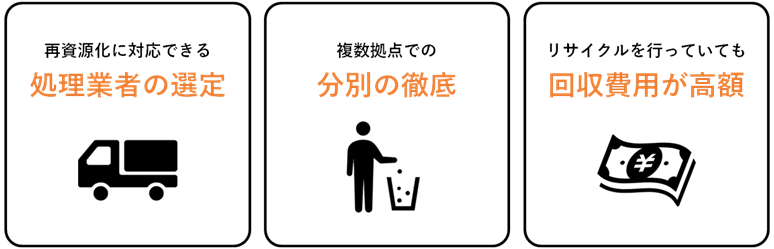 再資源化に対応できる処理業者の選定や複数拠点での分別の徹底が、お困りごととして挙げられました。再資源化を開始するにあたって、スキーム構築における情報収集や環境整備がハードルになっていることが伺えます。施策を実行する前の段階で、自治体ルールや廃棄物の扱い方の法的見解など把握しなければならないことが多く、それらを事業活動しながら進行することがネックとなっていると考えられます。