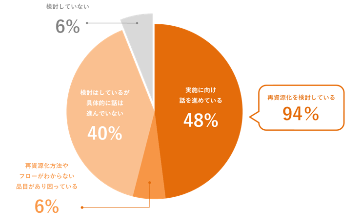 94%が再資源化の取り組みを検討しています。一方で、そのうち「実施に向けて話を進めている」のは48%、「困っている」「話が進んでいない」のは46%と、企業によって進行度に差があることが伺えます。