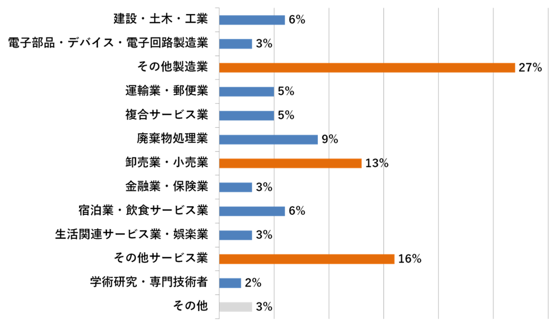 再資源化への取り組み状況やご関心について、アンケートを実施した12業種のうち製造業が27%と最も多く、ものづくりに関わる業界から再資源化に向けた取り組みが加速すると予想されます。次いでサービス業が16%、小売業が13%と続き、生産・提供・消費といった企業が携わる段階に関係なく再資源化の検討は広がることが期待されます。