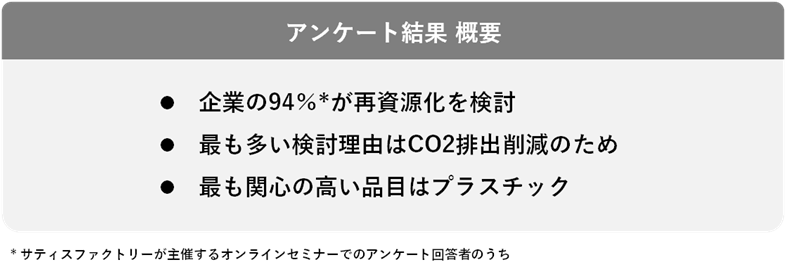 サティスファクトリーは、再資源化の動向や課題、取組みの効果を分析した書籍『再資源化白書2022』を発刊し、2022年10月に本書を解説するセミナーを開催しました。資源利用の見直しの観点から、脱炭素に向けた企業の課題解決のヒントを解説する中で、これから戦略立案や施策実行に向かう企業の皆様のご関心と課題が顕在化しました。