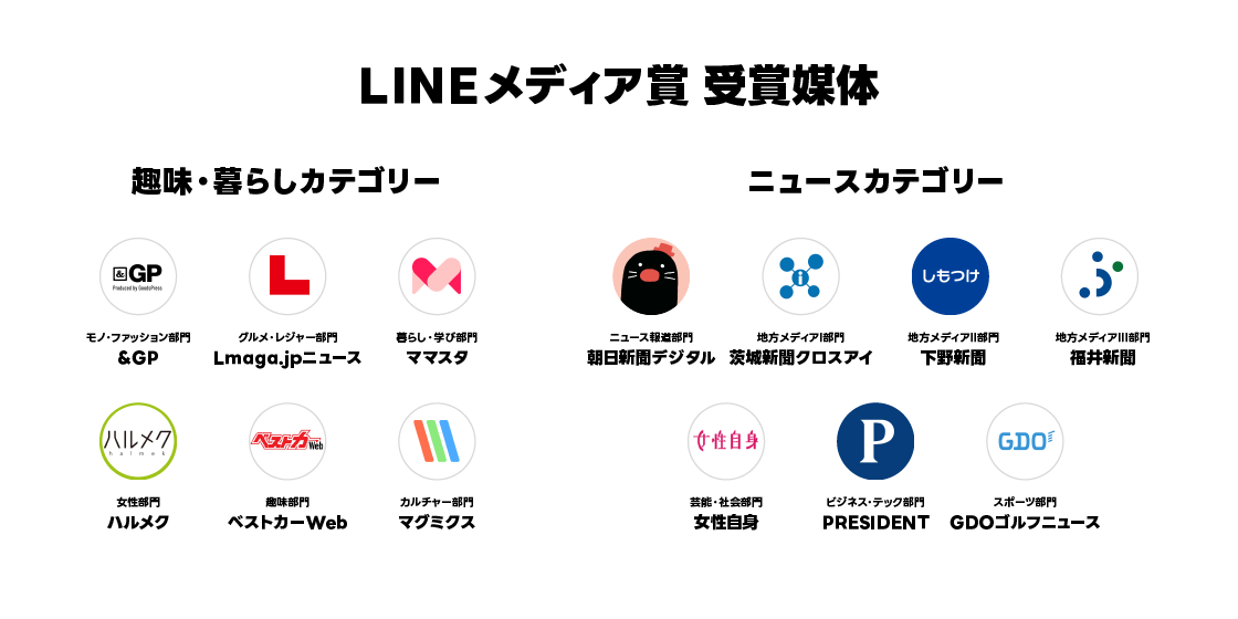 新聞社やテレビ局、ファッション誌やビジネス誌など 420 以上のメディアが厳選したニュースを配信する「LINE アカウントメディア」。参画メディアを 13 ジャンルに分け、各メディアの配信に対するユーザーの満足度を、独自の指標で「エンゲージメントランク」としてランキング化。1 年を通して、各ジャンルで特に高い支持を得たメディアが表彰されます。