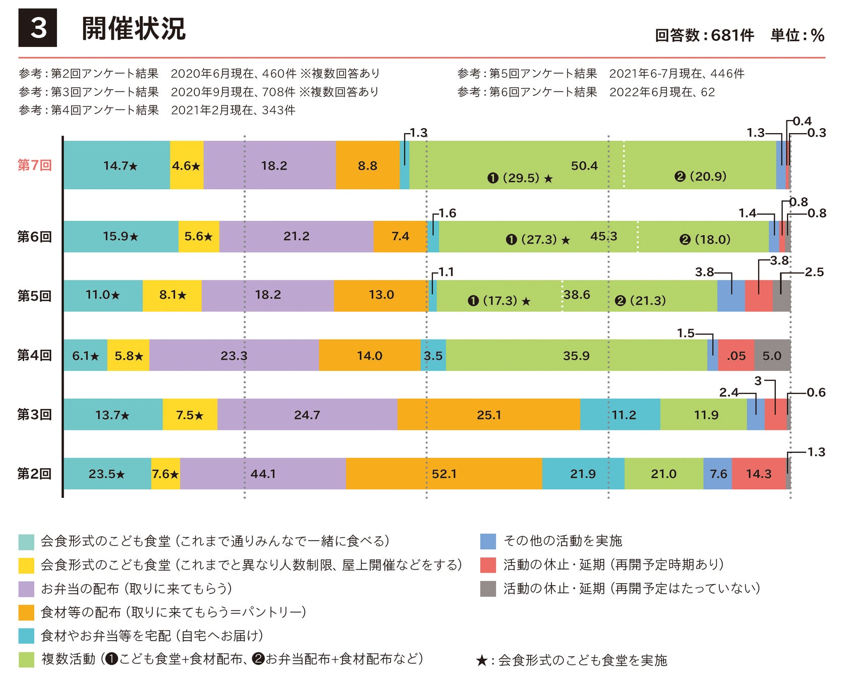 コロナ禍が始まって丸3年。なかなか明けないコロナ禍の中、これで最後になってほしいと思いながらアンケートを繰り返し、ついに第7回となってしまいました。今回も、全国のこども食堂のみなさんのお声と、そこから垣間見えるいつもながらの奮闘ぶりをお伝えしたいと思います。