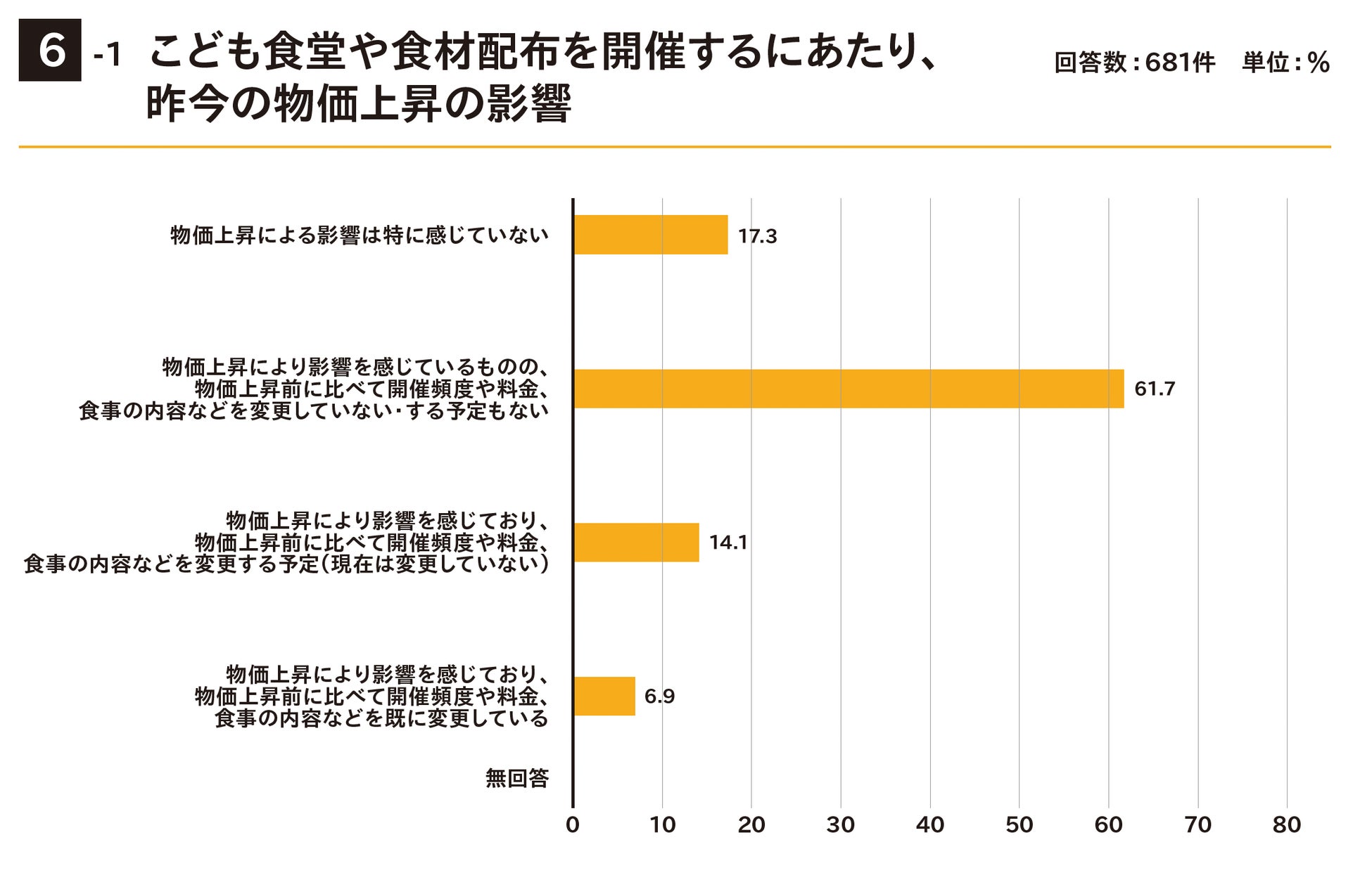 その結果、物価上昇による影響は82.7%が感じているものの、開催頻度や料金、食事の内容などを既に変更しているのは6.9%にとどまるとの回答が得られました。理事長の湯浅誠は「こども食堂は資金が潤沢にある活動ではありませんから、つまり、物価上昇に悲鳴を上げながらもその影響を参加者に転嫁せず、なんとかやりくりして踏みとどまっているということです」とコメントしています(コメント全文は末尾)。回答にご協力くださいました地域ネットワーク団体、こども食堂の皆さん、本当にありがとうございます。