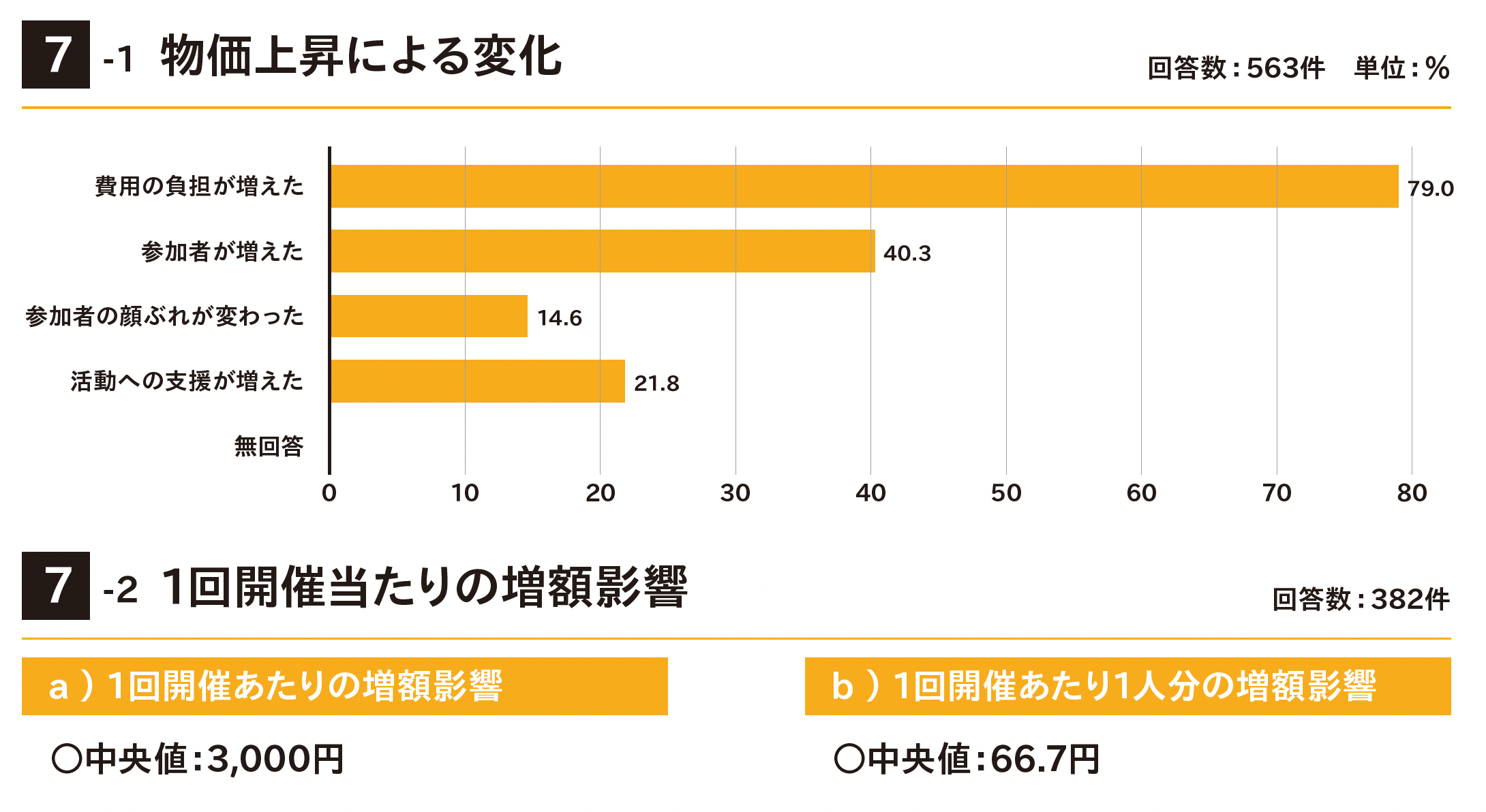 ・物価上昇による変化として、79.0%が費用の負担が増えたと回答。次いで参加者が増えた40.3%という結果となった。