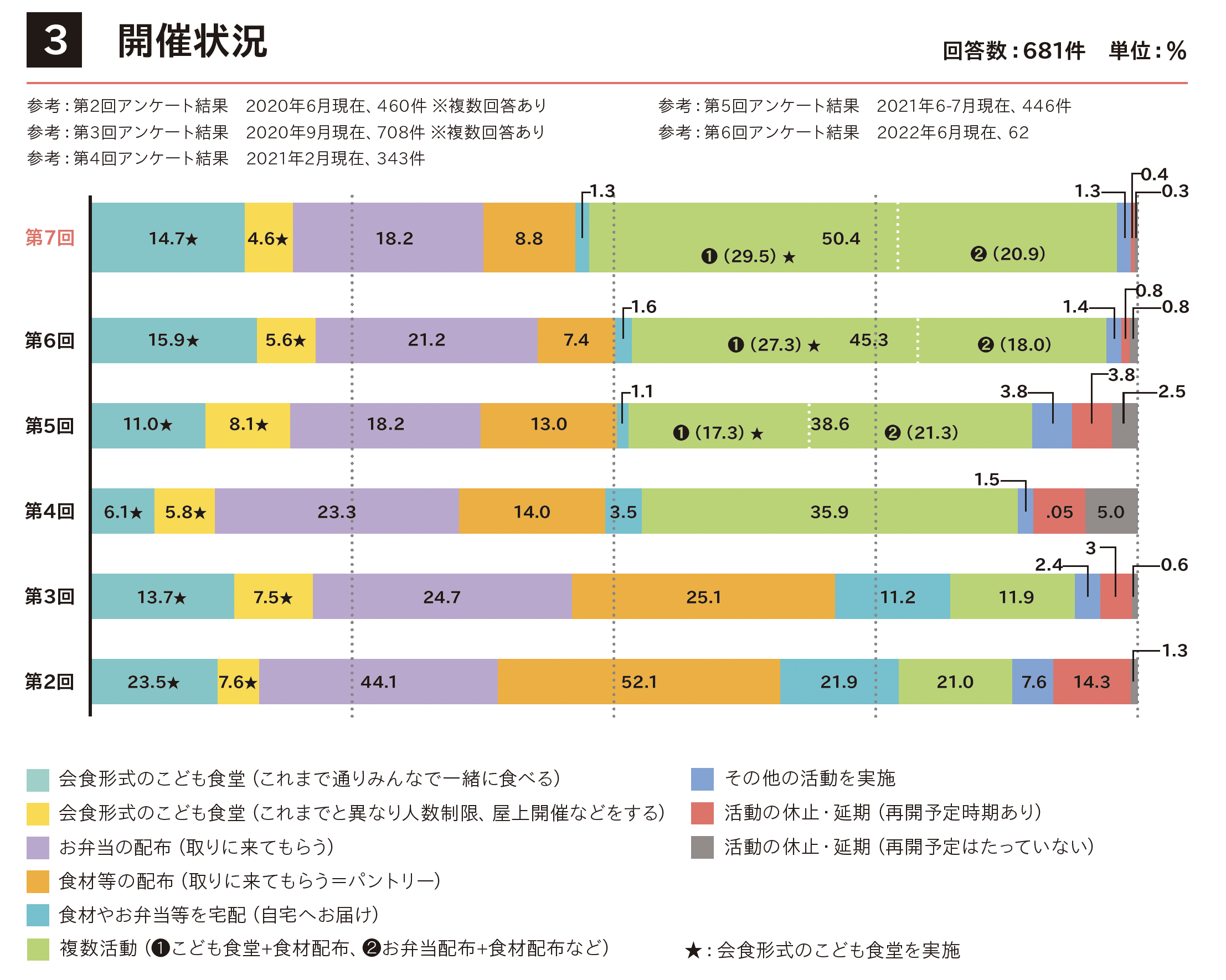 コロナ禍が始まって丸3年。なかなか明けないコロナ禍の中、これで最後になってほしいと思いながらアンケートを繰り返し、ついに第7回となってしまいました。今回も、全国のこども食堂のみなさんのお声と、そこから垣間見えるいつもながらの奮闘ぶりをお伝えしたいと思います。