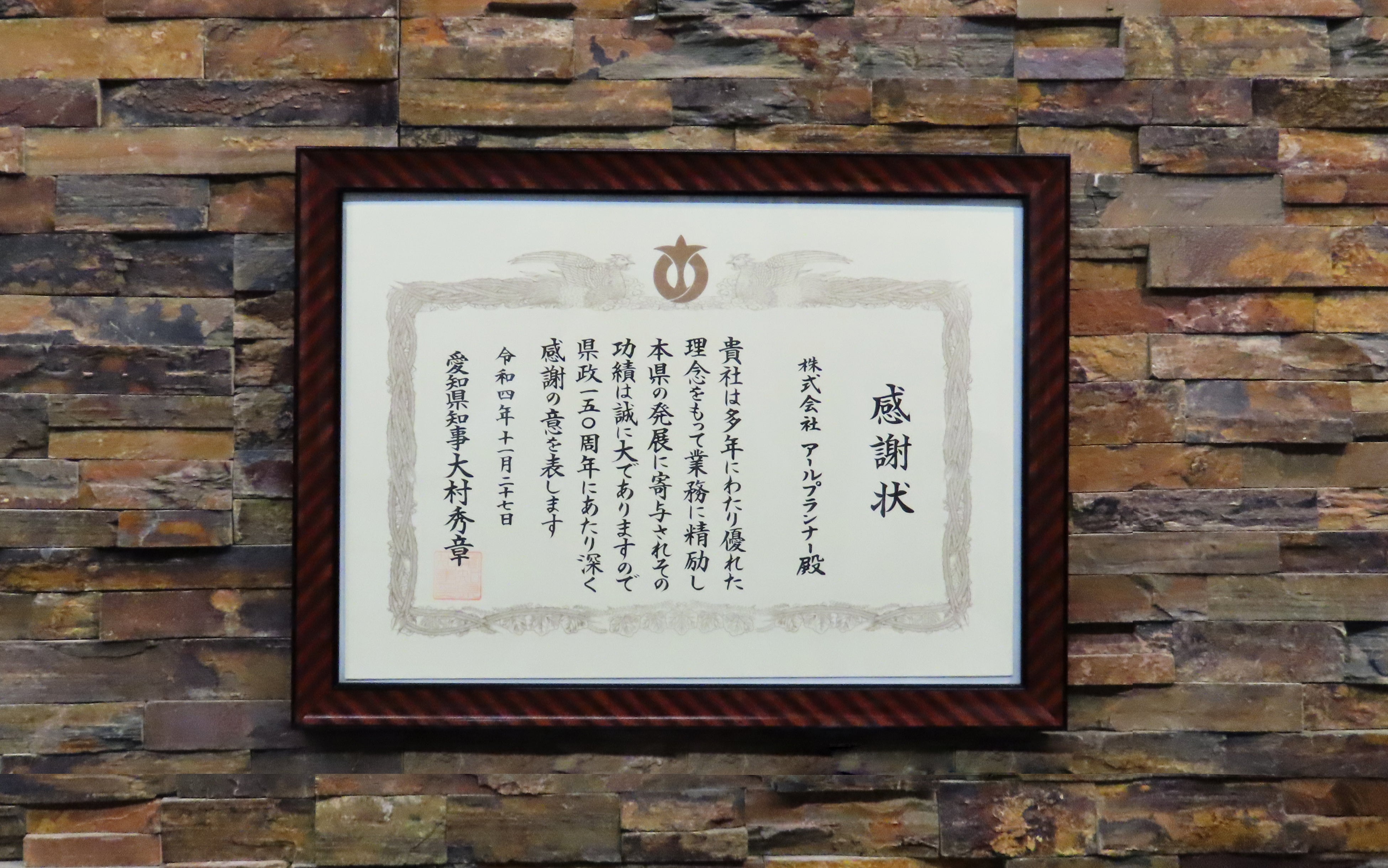 戸建住宅を中心とした住宅プラットフォーム事業を展開する株式会社アールプランナー(本社:名古屋市東区、代表取締役社長:梢 政樹、以下「当社」)は、2022年11月27日に愛知県の産業の発展などに功績・功労のある企業として愛知県政150周年記念感謝状を愛知県より拝受いたしました。