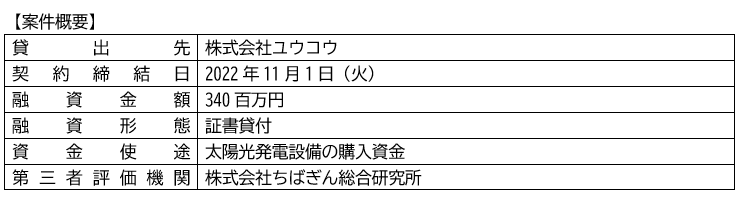 貸出先の株式会社ユウコウは、太陽光発電を主力とする再生可能エネルギーの発電事業を手掛けており、今回調達した資金は、太陽光発電設備(茨城県つくば市)の購入資金へ全額充当されます。再生可能エネルギー由来の電力を発電することにより、発電時のCO2排出量の削減が見込まれ、持続可能な環境・社会の実現への貢献が期待されます。