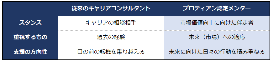 「現代版プロティアン」の理論と実践方法を体現し、自らのキャリア開発の実践及び個人向けの支援を希望される方向けの講座・認定資格となります。従来型のキャリアコンサルタントと、プロティアン認定メンターの最も大きな違いは、メンター自身が市場価値向上・変化適応に日々取り組んでいることです。その他の違いについて、以下の表をあわせてご参照ください。