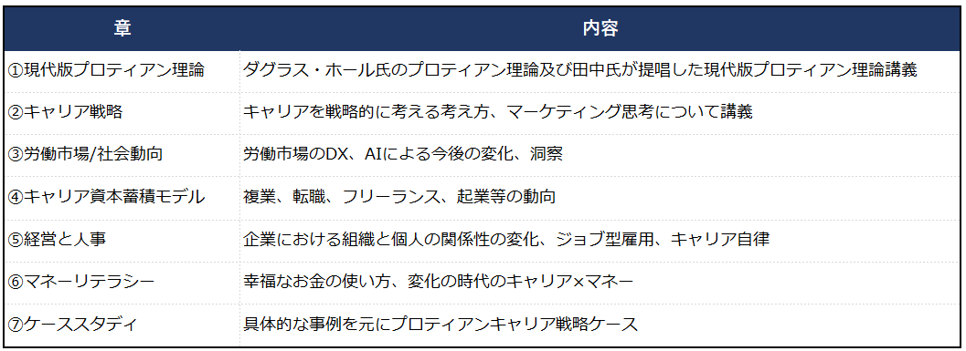 ※現代版プロティアン・キャリア:アメリカ心理学者であるダグラス・ホール(Douglas T. Hall)が、社会的変化に適合するための「変幻自在なキャリア」として1976年に提言したプロティアン・キャリア理論を、当協会代表の田中が100年時代に合わせてキャリア資本分析の考え方等を接合することで進化させた理論・実践手法。