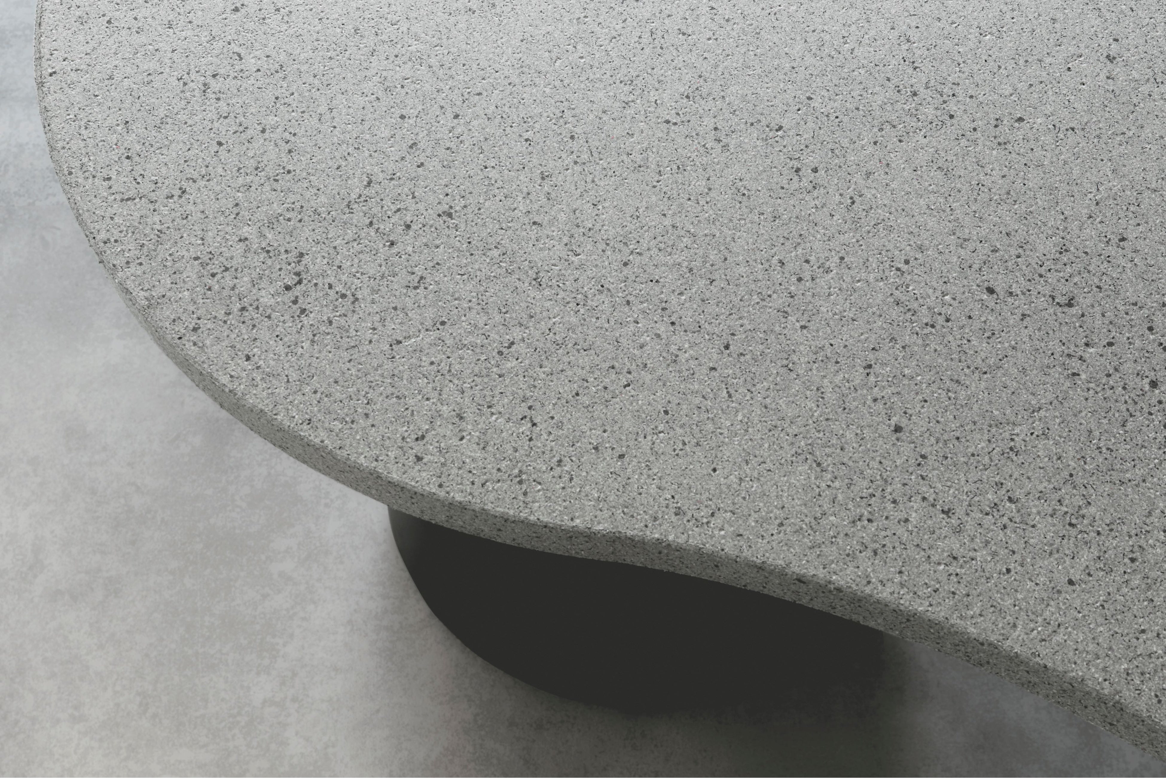 右:廃棄衣料のアップサイクルで作られたテーブルは、Tシャツ換算で約30枚分を再利用。