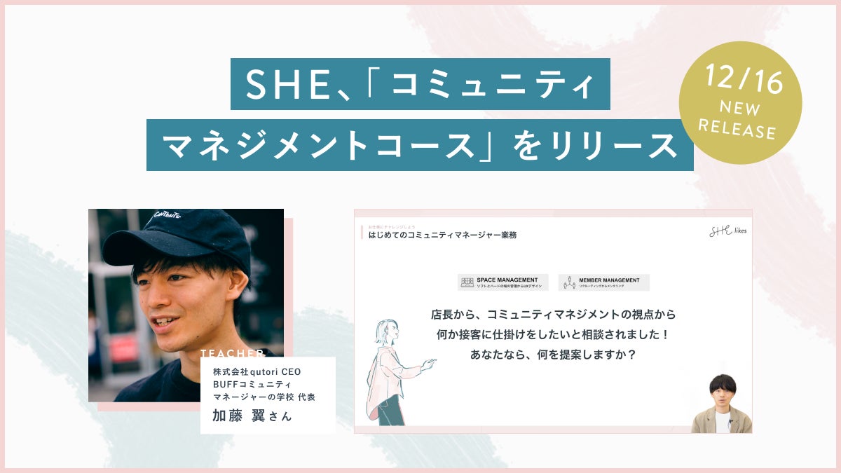 一方で、BUFF単独では社会へのコミュニティマネージャーの人材供給に限界があり、60,000名を超える受講生を有するミレニアル世代の女性向けのキャリアスクルール「SHElikes(シーライクス)」を運営するSHEと、女性のキャリアとしてコミュニティマネージャーを普及したいという想いが重なり、本コースのリリースに至りました。