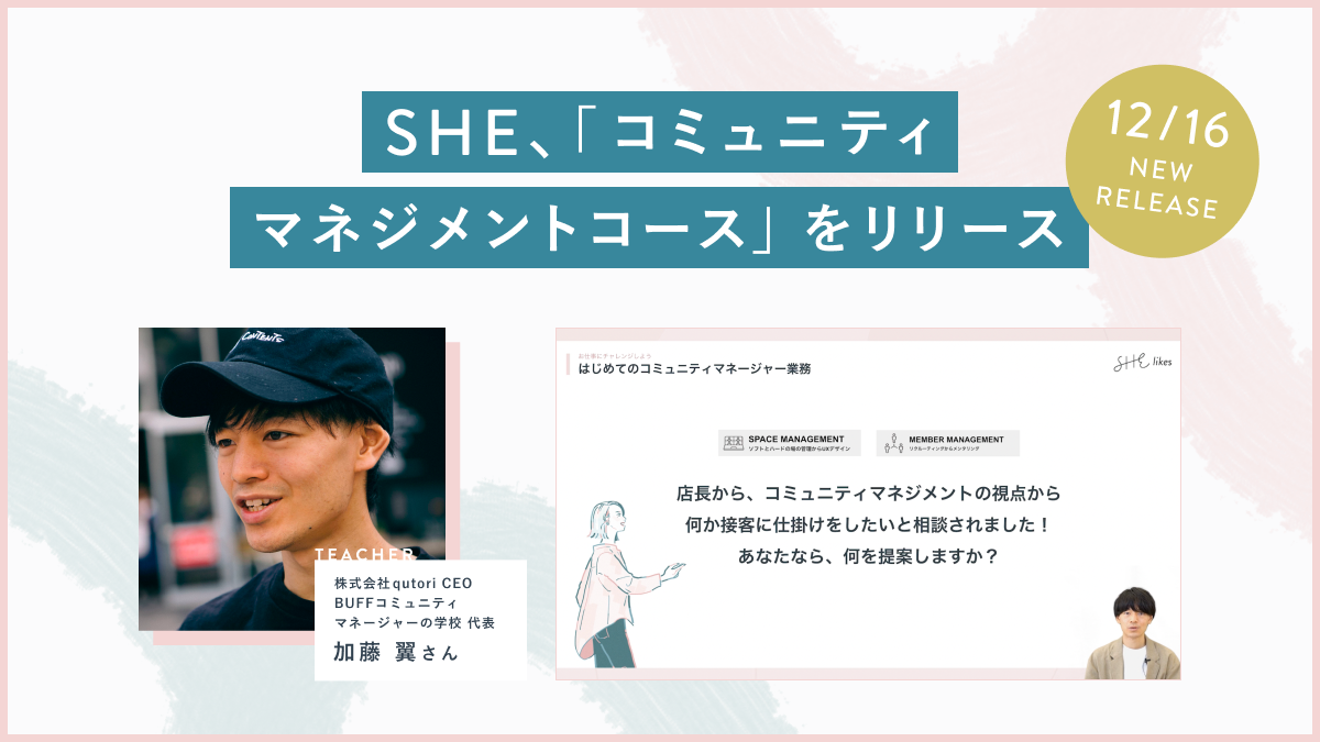 一方で、BUFF単独では社会へのコミュニティマネージャーの人材供給に限界があり、60,000名を超える受講生を有するミレニアル世代の女性向けのキャリアスクルール「SHElikes(シーライクス)」を運営するSHEと、女性のキャリアとしてコミュニティマネージャーを普及したいという想いが重なり、本コースのリリースに至りました。