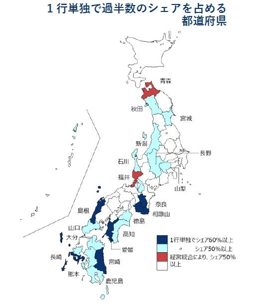 1行が単独過半数のシェアを有する都道府県は合計20に上り、前年に比べ変化はなかった。ただ、既に経営統合が発表されている青森県(青森銀行+みちのく銀行:シェア70.51%)、福井県(福井銀行+福邦銀行:同55.12%)を加えると、単独過半数シェアの都道府県は計22となる。愛知県では経営統合する愛知銀行と中京銀行のシェア合計は約1割にとどまるが、県内トップシェアの三菱UFJ銀行に次ぐ県内2番手の規模となる。2022年に新たに経営統合の方針が発表された長野県(八十二銀行+長野銀行:同61.62%)は、八十二銀行単独で県内シェア50%を超える。一方、福岡県における福岡銀行と福岡中央銀行のシェア合計は38.37%にとどまった。