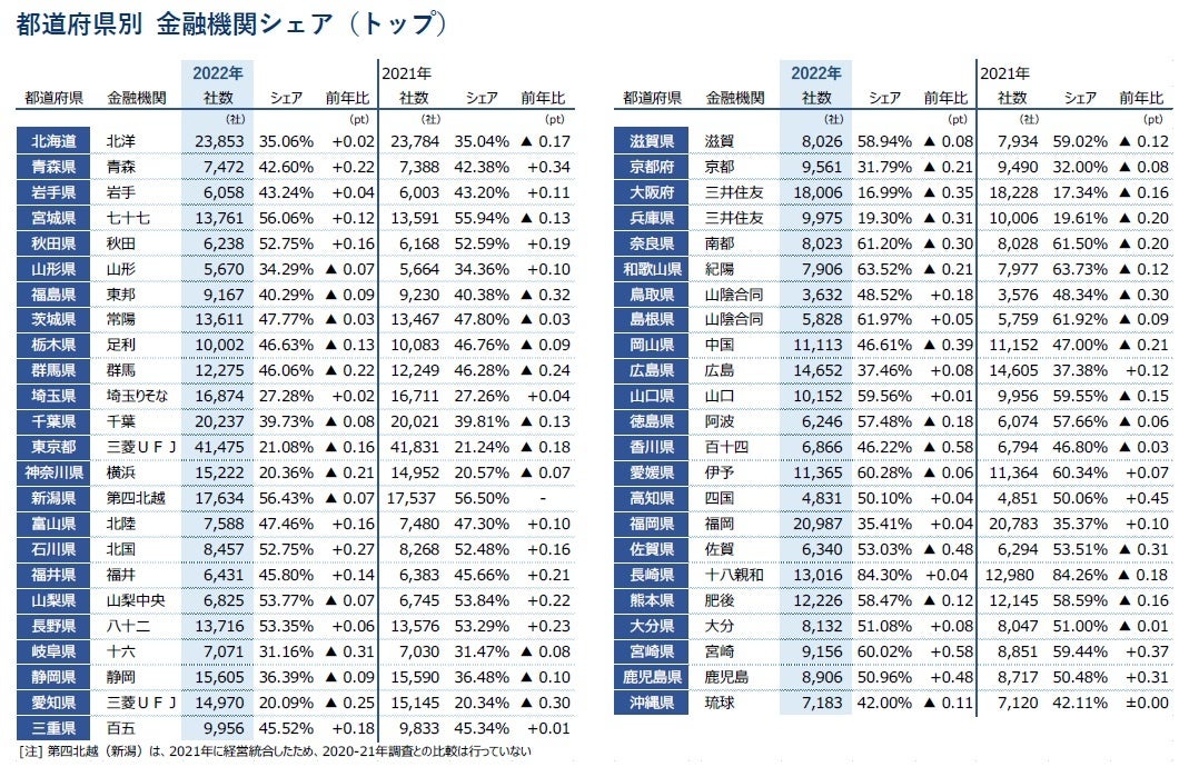 1行が単独過半数のシェアを有する都道府県は合計20に上り、前年に比べ変化はなかった。ただ、既に経営統合が発表されている青森県(青森銀行+みちのく銀行:シェア70.51%)、福井県(福井銀行+福邦銀行:同55.12%)を加えると、単独過半数シェアの都道府県は計22となる。愛知県では経営統合する愛知銀行と中京銀行のシェア合計は約1割にとどまるが、県内トップシェアの三菱UFJ銀行に次ぐ県内2番手の規模となる。2022年に新たに経営統合の方針が発表された長野県(八十二銀行+長野銀行:同61.62%)は、八十二銀行単独で県内シェア50%を超える。一方、福岡県における福岡銀行と福岡中央銀行のシェア合計は38.37%にとどまった。
