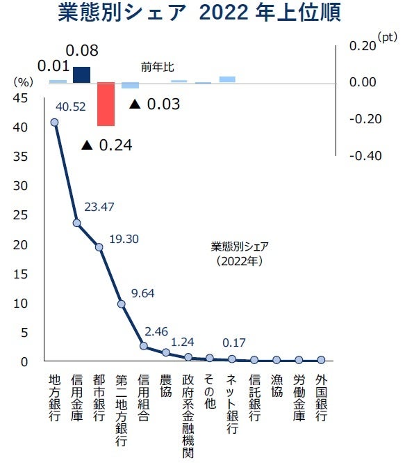 - 業態別にみると、シェアが最も高いのは「地方銀行」で40.52%となり、前年から0.01pt増加した。全業態のなかでは唯一3年連続でシェア4割を超え、2009年の調査開始以降、地方銀行のシェアは総じて拡大傾向が続いている