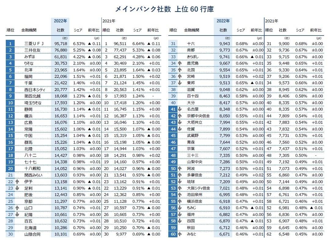 - 2022年の全国メインバンク社数トップは「三菱UFJ銀行」となった。企業数は9万5718社となり、2009年の調査開始以降14年連続のトップとなった。しかし、社数は減少が続いているほか、全国シェアも6.53%と前年から0.11ポイント(pt)減少。13年連続のシェア縮小となり、減少幅は21年に続き全金融機関で最大となっている