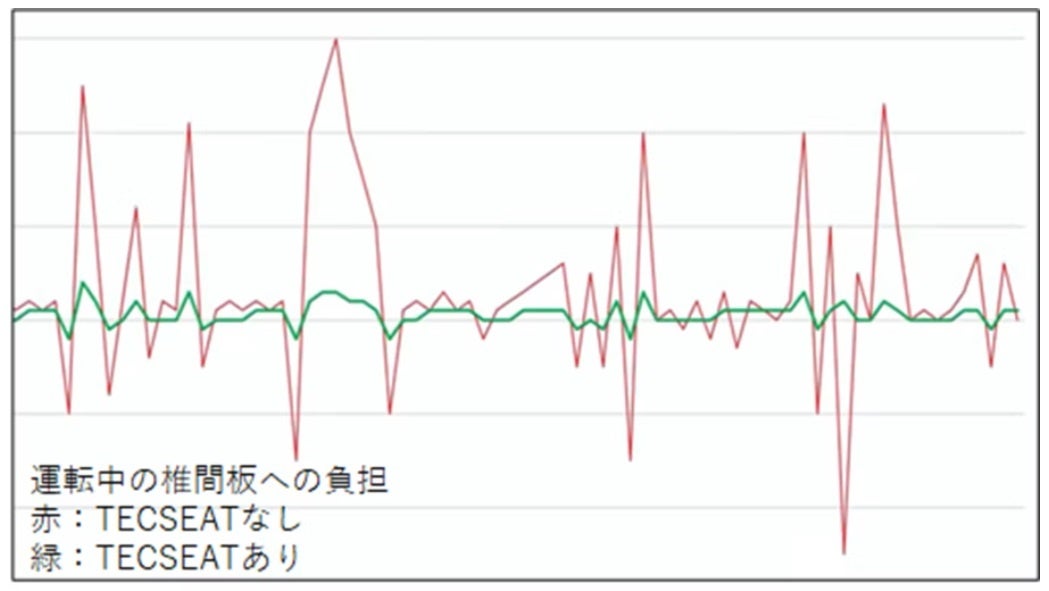 車の運転中にかかる脊髄への負担を計測したところ、SoftairSeatDriveがクッションとなり体圧分散し最大80%負担を軽減することがわかりました。