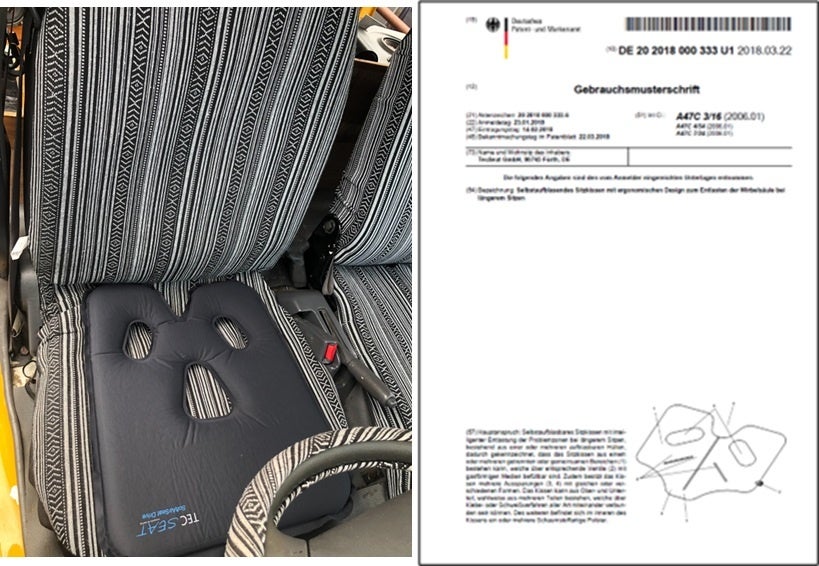 SoftairSeatDriveは人間工学に基づき通常の椅子用に開発されたSoftairSeaHybridを車の運転(Drive)用に改良され発売されました。バルブを開くだけで膨らむ設計と尾骨が浮く設計はドイツ特許取得済。