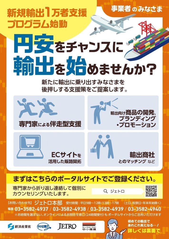本プログラムでは、経済産業省、中小企業庁、ジェトロ及び中小機構が一体となり、全国の商工会・商工会議所等とも協力しながら、(1)新たに輸出に挑戦する事業者の掘り起こし、(2)専門家による事前の輸出診断、(3)輸出用の商品開発や売込みにかかる費用への補助、(4)輸出商社とのマッチングやECサイト出展への支援、などを一気通貫で実施します。