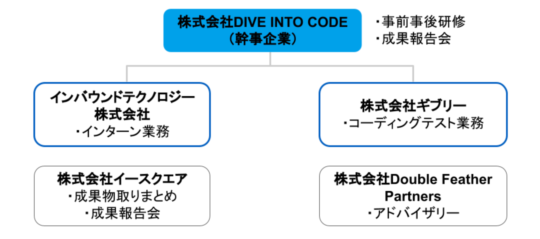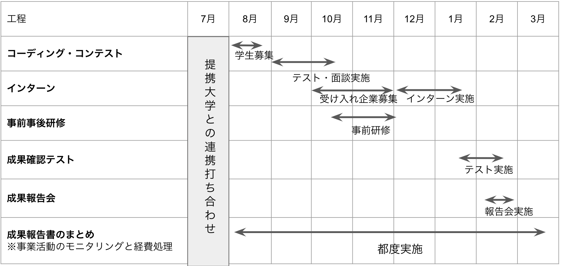 事業目的を達成するため、事業対象地域に在住する IT スキルを有する学生等を対象に、コーディング・コンテスト及び人材育成を実施します。具体的には、経済産業省の指示に基づき、以下の6つの業務の取りまとめを行います。