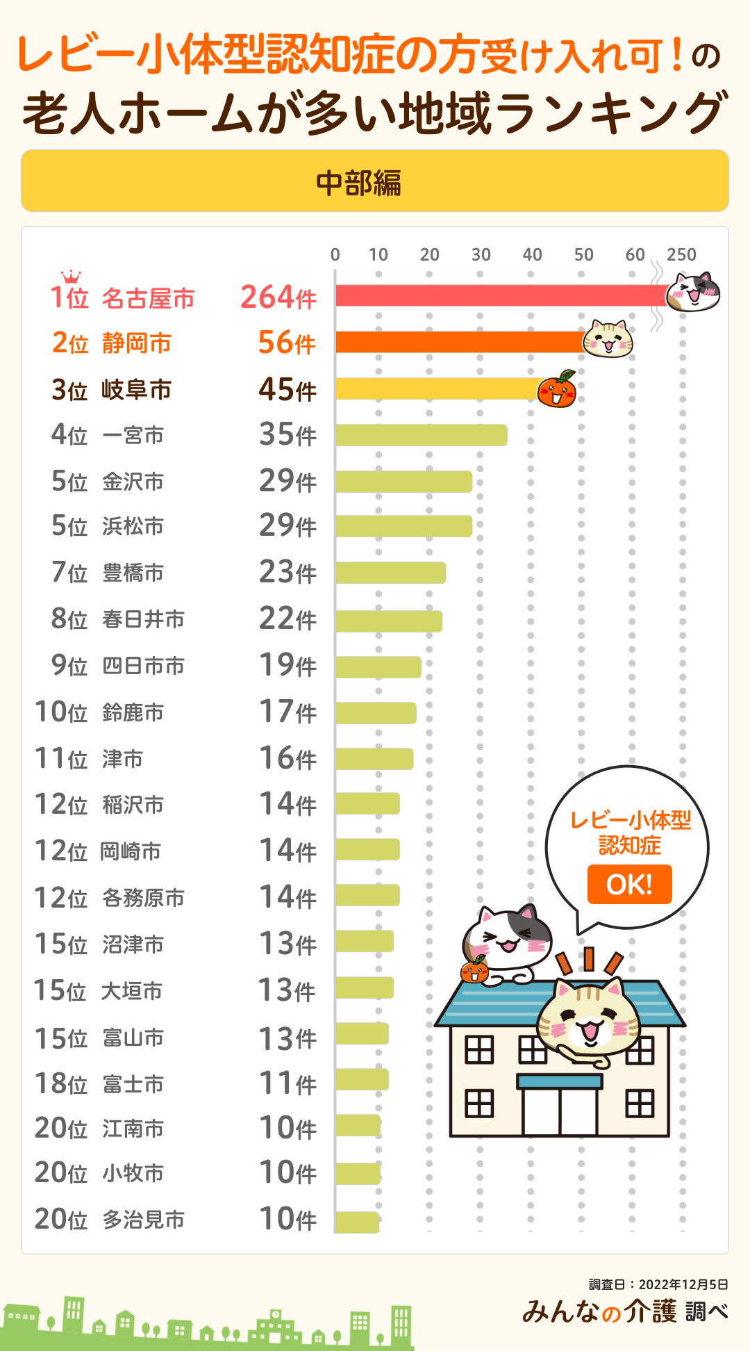 テキスト版「レビー小体型認知症の方を受け入れ可能な老人ホーム」な老人ホームが多い地域ランキング(中部エリア)