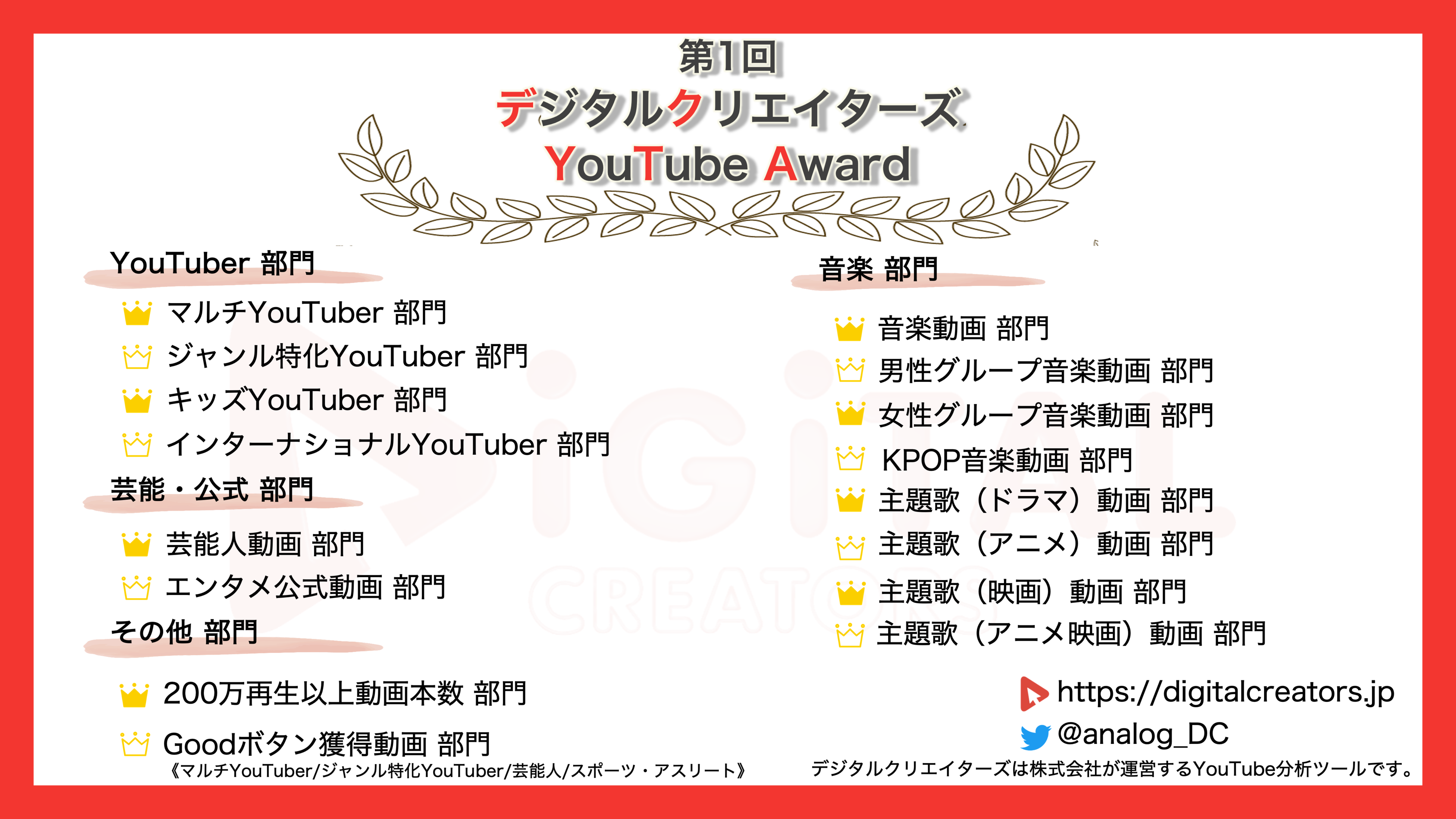 「第1回 デジタルクリエイターズ YouTube Award」と称し、12月16日(金)より、勝手に様々なジャンルの年間ランキングを発表いたします。